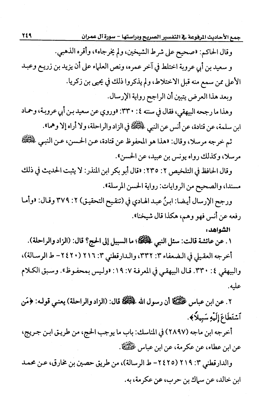 وهذا ما رجحه البيهقي، فقال في سننه 4: 330: "وروي عن سعيد بن أبي عروبة، وحماد ابن سلمة، عن قتادة عن أنس عن النبي -صلى الله عليه وسلم- في الزاد والراحلة، ولا أراه إِلا وهما".