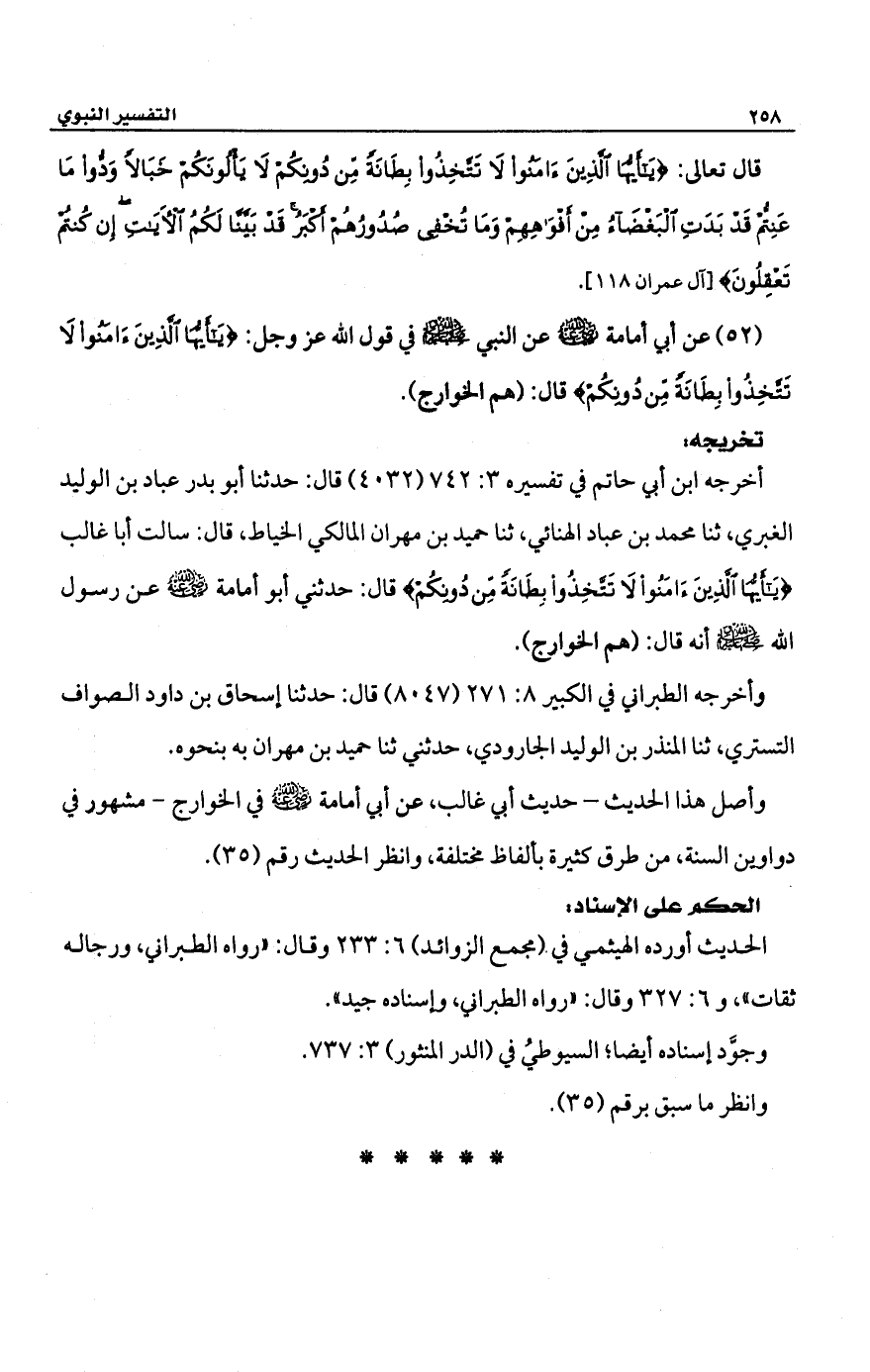 (52) عن أبي أمامة -رضي الله عنه- عن النبي -صلى الله عليه وسلم- في قول الله عز وجل: {يَاأَيُّهَا الَّذِينَ آمَنُوا لَا تَتَّخِذُوا بِطَانَةً مِنْ دُونِكُمْ} قال: (هم الخوارج).