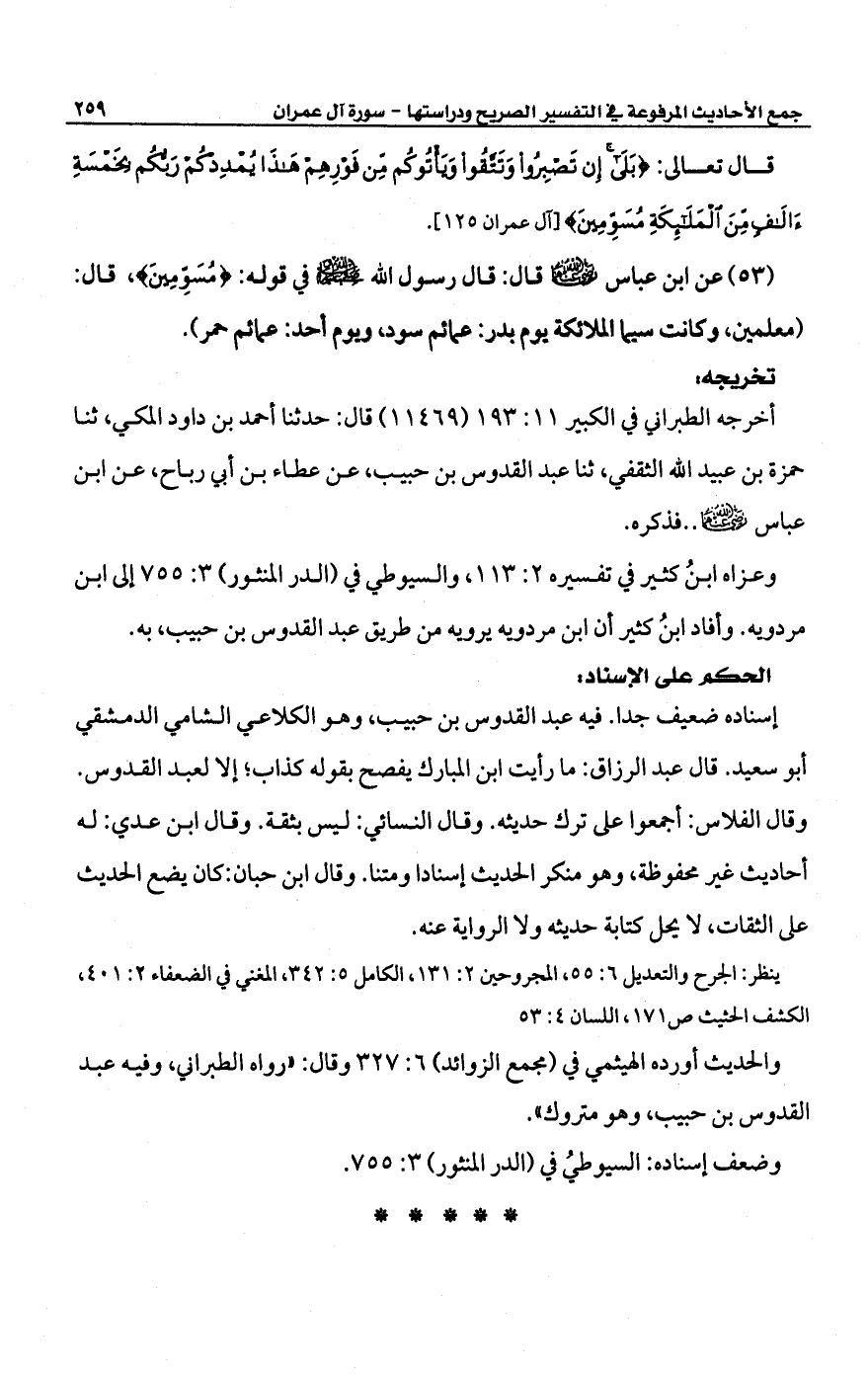 (53) عن ابن عباس -رضي الله عنهما- قال: قال رسول الله -صلى الله عليه وسلم- في قوله: {مُسَوِّمِينَ}، قال: (معلمين، وكانت سيما الملائكة يوم بدر: عمائم سود، ويوم أحد: عمائم حمر).