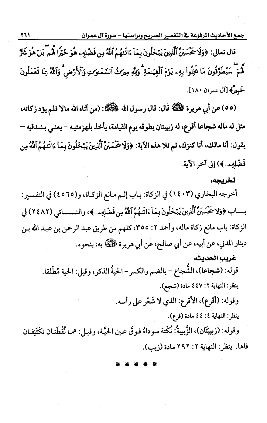 (55) عن أبي هريرة -رضي الله عنه- قال: قال رسول -صلى الله عليه وسلم-: (من آتاه الله مالا فلم يؤد زكاته، مثل له ماله شجاعا أقرع، له زبيبتان يطوقه يوم القيامة، يأخذ بلهزمتيه -يعش بشدقيه- يقول: أنا مالك، أنا كنزك ثم تلا هذه الية: {وَلَا يَحْسَبَنَّ الَّذِينَ يَبْخَلُونَ بِمَا آتَاهُمُ اللَّهُ مِنْ فَضْلِهِ ..}) إلى آخر الآية.