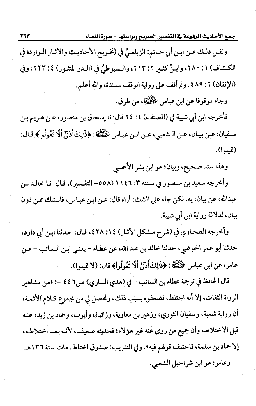 وأخرجه الطحاوي في (شرح مشكل الآثار) 14: 428، قال: حدثنا ابن أبي داود، حدثنا أبو عمر الحوضي، حدثنا خالد بن عبد الله، عن عطاء -يعني ابن السائب- عن عامر، عن ابن عباس -رضي الله عنهما-: {ذَلِكَ أَدْنَى أَلَّا تَعُولُوا} قال: (لا تميلوا).