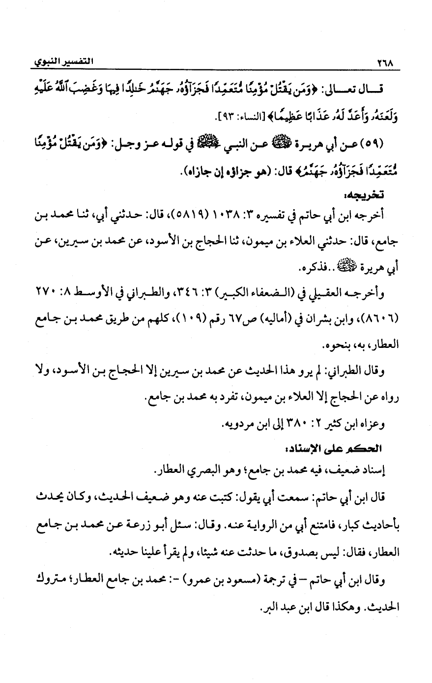 (59) عن أبي هريرة -رضي الله عنه- عن النبي -صلى الله عليه وسلم- في قوله عز وجل: {وَمَنْ يَقْتُلْ مُؤْمِنًا مُتَعَمِّدًا فَجَزَاؤُهُ جَهَنَّمُ} قال: (هو جزاؤه إن جازاه).