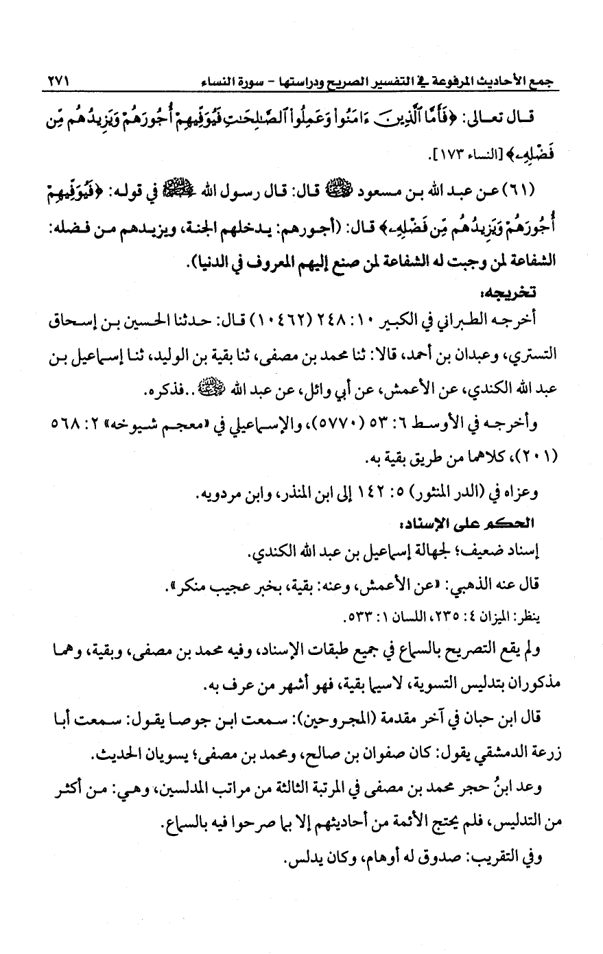 (61) عن عبد الله بن مسعود -رضي الله عنه- قال: قال رسول الله -صلى الله عليه وسلم- في قوله: {فَيُوَفِّيهِمْ أُجُورَهُمْ وَيَزِيدُهُمْ مِنْ فَضْلِهِ} قال: (أجورهم: يدخلهم الجنة، ويزيدهم من فضله: الشفاعة لمن وجبت له الشفاعة لمن صنع إليهم المعروف في الدنيا).