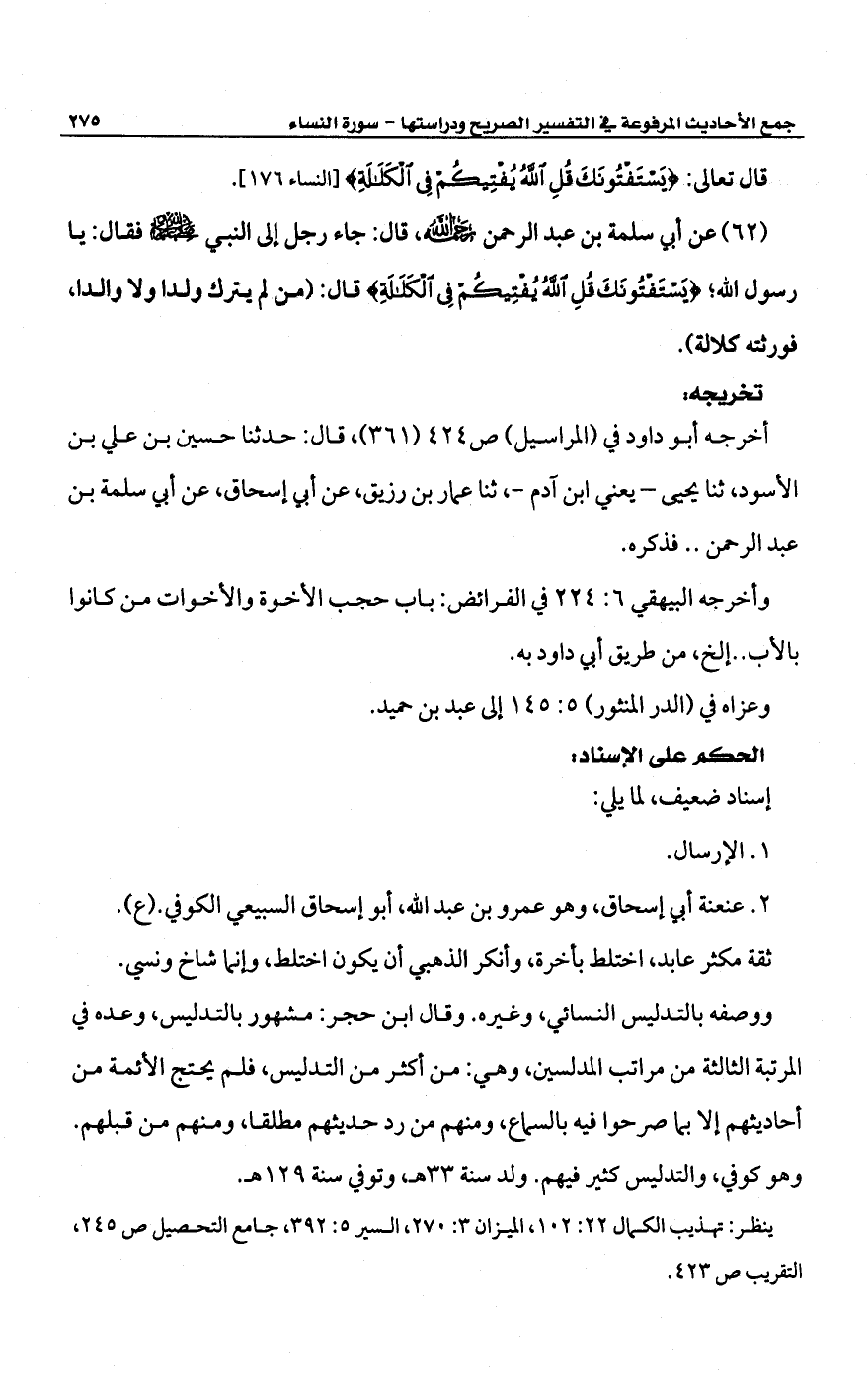 (62) عن أبي سلمة بن عبد الرحمن رحمه الله، قال: جاء رجل إلى النبي -صلى الله عليه وسلم- فقال: يا رسول الله؛ {يَسْتَفْتُونَكَ قُلِ اللَّهُ يُفْتِيكُمْ فِي الْكَلَالَةِ} قال: (من لم يترك ولدا ولا والدا، فورثته كلالة).