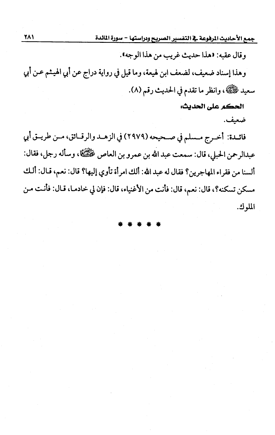 فائدة: أخرج مسلم في صحيحه (2979) في الزهد والرقائق، من طريق أبي عبد الرحمن الحبلي، قال: سمعت عبد الله بن عمرو بن العاص -رضي الله عنهما-، وسأله رجل، فقال: ألسنا من فقراء المهاجرين؟ فقال له عبد الله: ألك امرأة تأوي إليها؟ قال: نعم، قال: ألك مسكن تسكنه؟، قال: نعم، قال: فأنت من الأغنياء، قال: فإن لي خادما، قال: فأنت من الملوك.