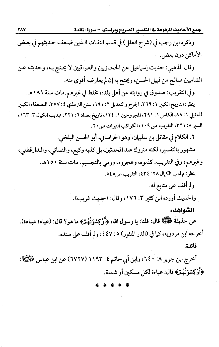 عن حذيفة -رضي الله عنه- قال: قلنا: يا رسول الله، {أَوْ كِسْوَتُهُمْ}، ما هو؟ قال: (عباءة عباءة). أخرجه ابن مردويه، كما في (الدر المنثور) 5: 447، ولم أقف على سنده.