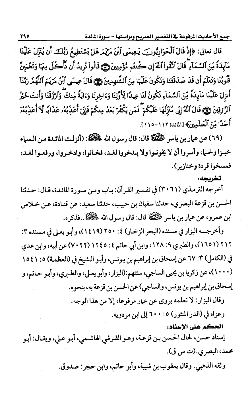 أخرجه الترمذي (3061) في تفسير القرآن: باب ومن سورة المائدة قال: حدثنا الحسن بن قزعة البصري، حدثنا سفيان بن حبيب، حدثنا سعيد، عن قتادة عن خلاس ابن عمرو، عن عمار بن ياسر -رضي الله عنهما- قال: قال رسول الله -صلى الله عليه وسلم- .. فذكره.