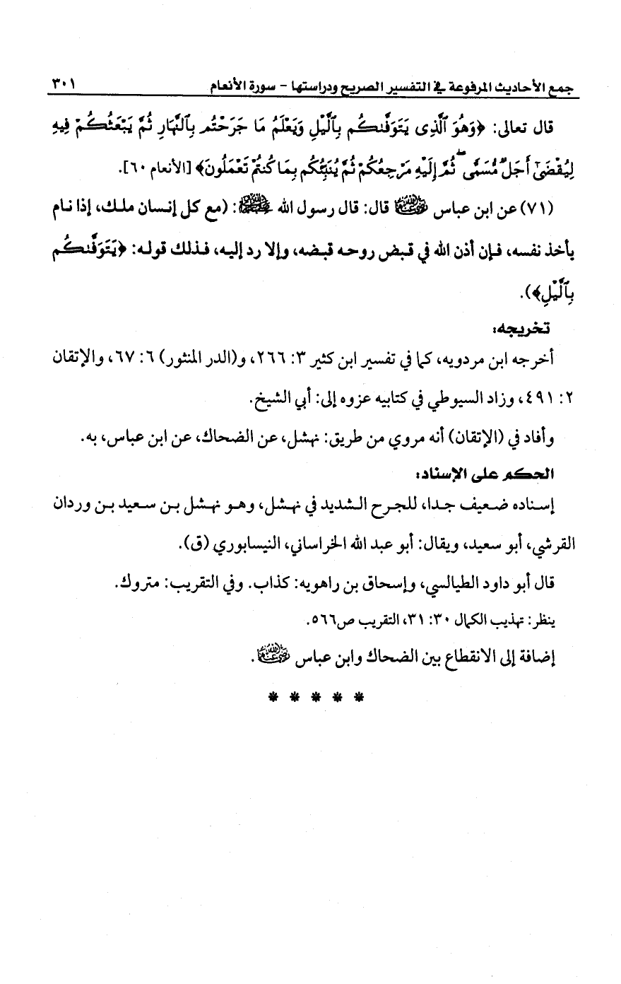 (71) عن ابن عباس-رضي الله عنهما- قال: قال رسول الله -صلى الله عليه وسلم-: (مع كل إنسان ملك، إذا نام يأخذ نفسه، فإن أذن إلله في قبص روحه قبضه، وإلا رد إليه، فذلك قوله: {يَتَوَفَّاكُمْ بِاللَّيْلِ}).