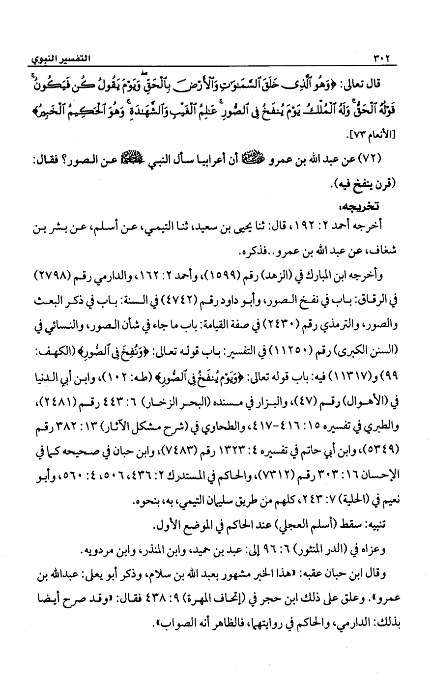 (72) عن عبد الله بن عمرو -رضي الله عنهما- أن أعرابيا سأل النبي -صلى الله عليه وسلم- عن الصور؟ فقال: (قرن ينفخ فيه).