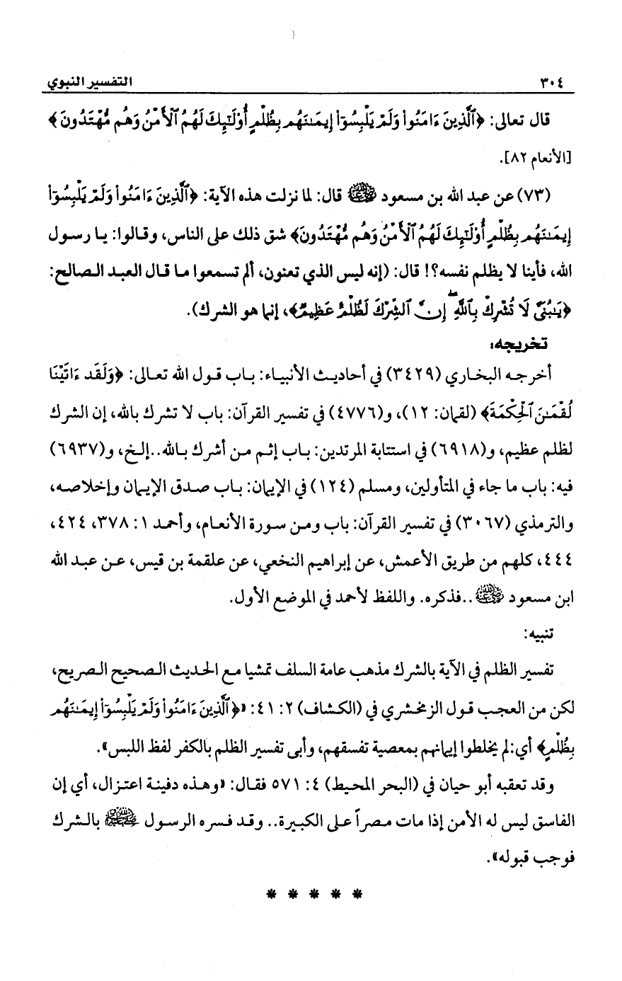 (73) عن عبد الله بن مسعود -رضي الله عنه- قال: لما نزلت هذه الأية: {الَّذِينَ آمَنُوا وَلَمْ يَلْبِسُوا إِيمَانَهُمْ بِظُلْمٍ أُولَئِكَ لَهُمُ الْأَمْنُ وَهُمْ مُهْتَدُونَ} شق ذلك على الناس، وقالوا: يا رسول الله، فأينا لا يظلم نفسه؟! قال: (أنه ليس الذي تعنون، ألم تسمعوا ما قال العبد الصالح: {يَابُنَيَّ لَا تُشْرِكْ بِاللَّهِ إِنَّ الشِّرْكَ لَظُلْمٌ عَظِيمٌ}، إنما هو الشرك).