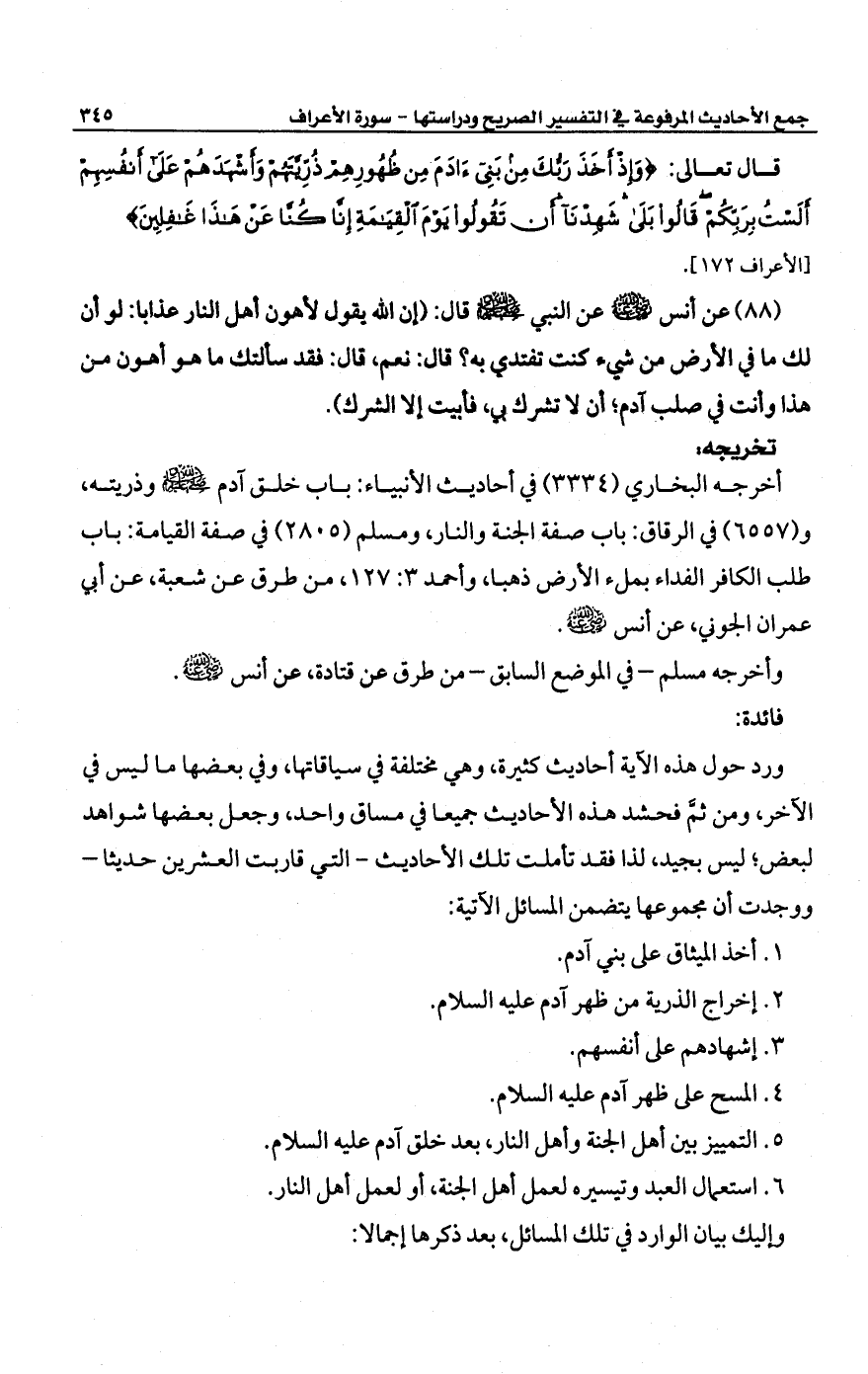 (88) عن أنس -رضي الله عنه- عن النبي -صلى الله عليه وسلم- قال: (إن الله يقول لأهون أهل النار عذابا: لو أن لك ما في الأرض من شيء كنت تفتدي به؟ قال: نعم، قال: فقد سألتك ما هو أهون من هذا وأنت في صلب آدم؛ أن لا تشرك بي، فأبيت إلا الشرك).