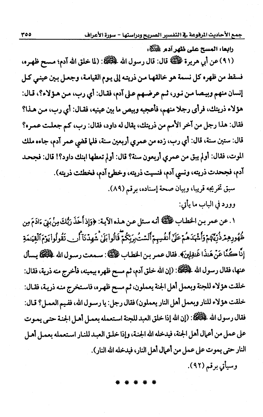 1 - عن عمر بن الخطاب -رضي الله عنه- أنه سئل عن هذه الآية: {وَإِذْ أَخَذَ رَبُّكَ مِنْ بَنِي آدَمَ مِنْ ظُهُورِهِمْ ذُرِّيَّتَهُمْ وَأَشْهَدَهُمْ عَلَى أَنْفُسِهِمْ أَلَسْتُ بِرَبِّكُمْ قَالُوا بَلَى شَهِدْنَا أَنْ تَقُولُوا يَوْمَ الْقِيَامَةِ إِنَّا كُنَّا عَنْ هَذَا غَافِلِينَ}. فقال عمر بن الخطاب -رضي الله عنه-: سمعت رسول الله -صلى الله عليه وسلم- يسأل عنها، فقال رسول الله -صلى الله عليه وسلم-: (إن الله خلق آدم, ثم مسح ظهره بيمينه، فأخرج منه ذرية, فقال: خلقت هؤلاء للجنة وبعمل أهل الجنة يعملون, ثم مسح ظهره, فاستخرج منه ذرية، فقال: خلقت هؤلاء للنار وبعمل أهل النار يعملون) فقال رجل: يا رسول الله، ففيم العمل؟ قال: فقال رسول الله-صلى الله عليه وسلم-: (إن الله إذا خلق العبد للجنة استعمله بعمل أهل الجنة حتى يموت على عمل من أعمال أهل الجنة, فيدخله الله الجنة, وإذا خلق العبد للنار استعمله بعمل أهل النار حتى يموت على عمل من أعمال أهل النار، فيدخله الله النار).
