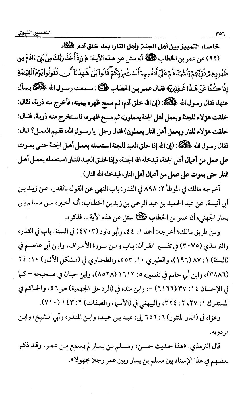 (92) عن عمر بن الخطاب -رضي الله عنه- أنه سئل عن هذه الآية: {وَإِذْ أَخَذَ رَبُّكَ مِنْ بَنِي آدَمَ مِنْ ظُهُورِهِمْ ذُرِّيَّتَهُمْ وَأَشْهَدَهُمْ عَلَى أَنْفُسِهِمْ أَلَسْتُ بِرَبِّكُمْ قَالُوا بَلَى شَهِدْنَا أَنْ تَقُولُوا يَوْمَ الْقِيَامَةِ إِنَّا كُنَّا عَنْ هَذَا غَافِلِينَ}، فقال عمر بن الخطاب -رضي الله عنه-: سمعت رسول الله -صلى الله عليه وسلم- يسأل عنها، فقال رسول الله -صلى الله عليه وسلم-: (إن الله خلق آدم, ثم مسح ظهره بيمينه، فأخرج منه ذرية، فقال: خلقت هؤلاء للجنة وبعمل أهل الجنة يعملون, ثم مسح ظهره, فاستخرج منه ذرية, فقال: خلقت هؤلاء للنار وبعمل أهل النار يعملون) فقال رجل: يا رسول الله، ففيم العمل؟ قال: فقال رسول الله -صلى الله عليه وسلم-: (ان الله إذا خلق العبد للجنة استعمله بعمل أهل الجنة حتى يموت على عمل من أعمال أهل الجنة، فيدخله الله الجنة، وإذا خلق العبد للنار استعمله بعمل أهل النار حتى يموت على عمل من أعمال أهل النار، فيدخله الله النار).