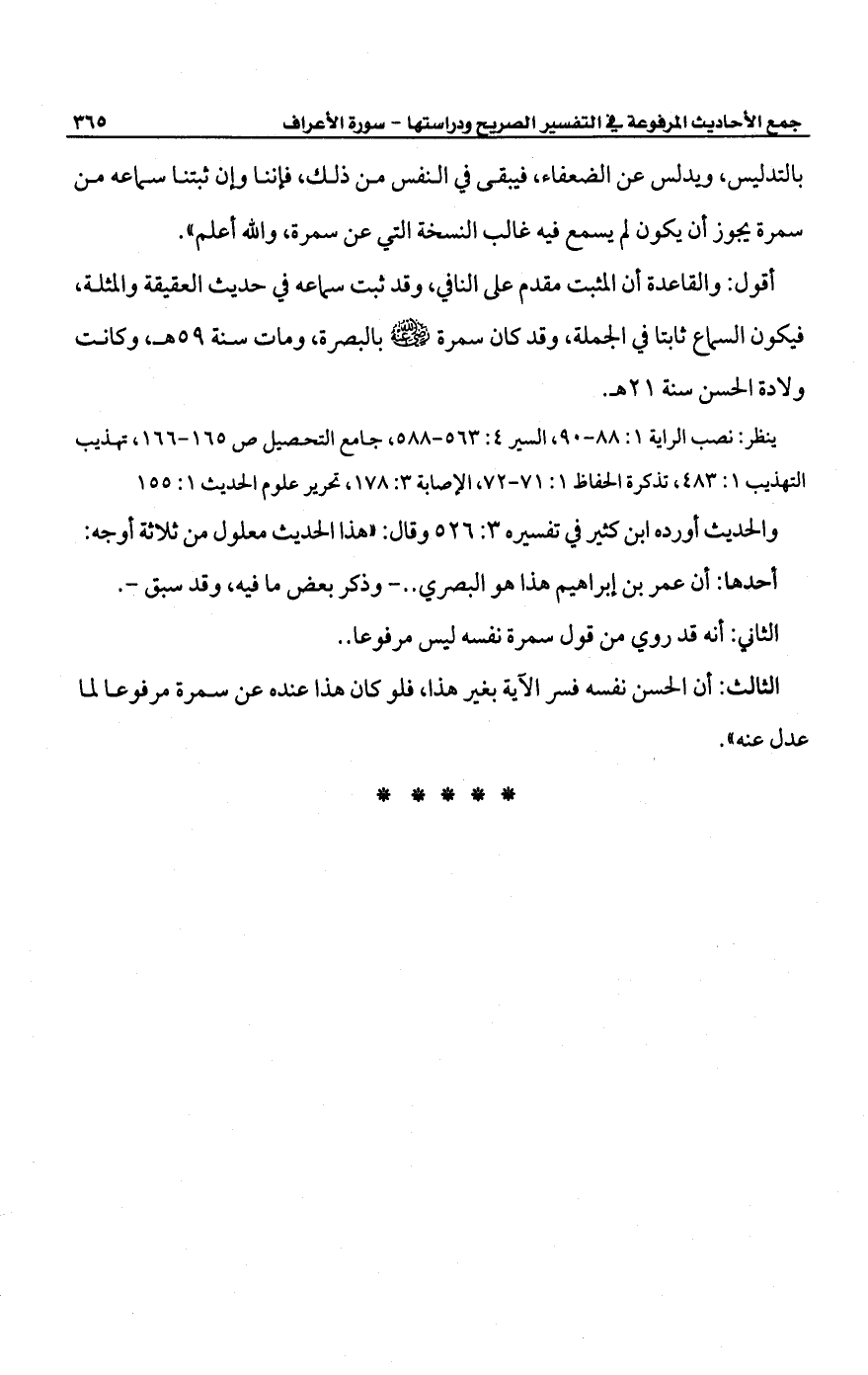 أقول: والقاعدة أن المثبت مقدم على النافي، وقد ثبت سماعه في حديث العقيقة والمثلة، فيكون السماع ثابتا في الجملة، وقد كان سمرة -رضي الله عنه- بالبصرة، ومات سنة 59 هـ، وكانت ولادة الحسن سنة 21 هـ.