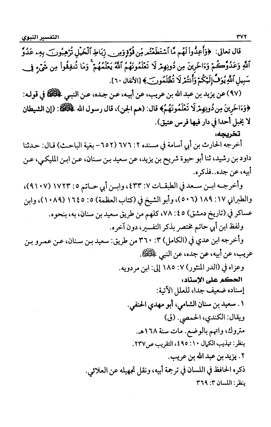 (97) عن يزيد بن عبد الله بن عريب, عن أبيه, عن جده, عن النبي -صلى الله عليه وسلم- في قوله: {وَآخَرِينَ مِنْ دُونِهِمْ لَا تَعْلَمُونَهُمُ} قال: (هم الجن)، قال رسول الله -صلى الله عليه وسلم-: (إن الشيطان لا يخبل أحدا في دار فيها فرس عتيق).