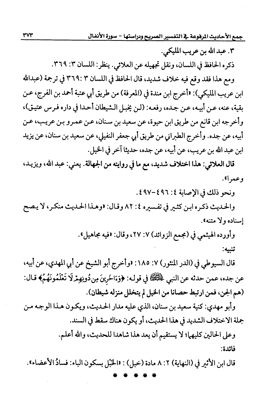 ومع هذا فقد وقع فيه خلاف شديد، قال الحافظ في اللسان 3: 369 في ترجمة (عبد الله ابن عريب المليكي): "أخرج ابن مندة في (المعرفة) من طريق أبي عتبة أحمد بن الفرج، عن بقية، عنه، عن أبيه، عن جده، رفعه: (لن يخبل الشيطان أحدا في داره فرس عتيق)، وأخرجه ابن قانع من طريق ابن حيوة، عن سعيد بن سنان، عن عمرو بن عريب، عن أبيه، عن جده. وأخرج الطبراني من طريق أبي جعفر النفيلي، عن سعيد بن سنان، عن يزيد ابن عبد الله بن عريب، عن أبيه، عن جده، حديثا آخر في الخيل.