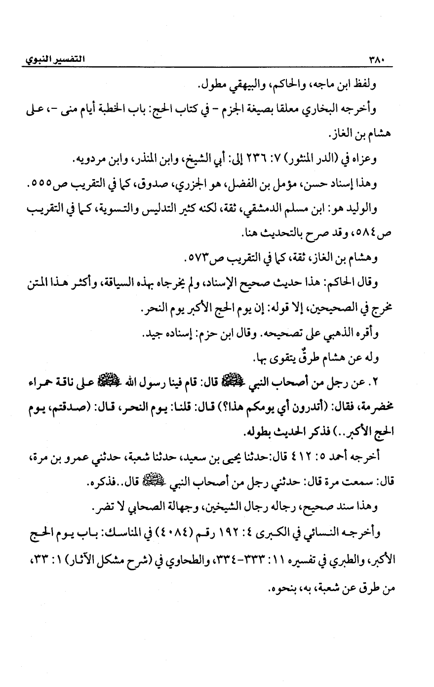 وأخرجه النسائي في الكبرى 4: 192 رقم (4084) في المناسك: باب يوم الحج الأكبر، والطبري في تفسيره 11: 333 - 334، والطحاوي في (شرح مشكل الآثار) 1: 33، من طرق عن شعبة، به، بنحوه.