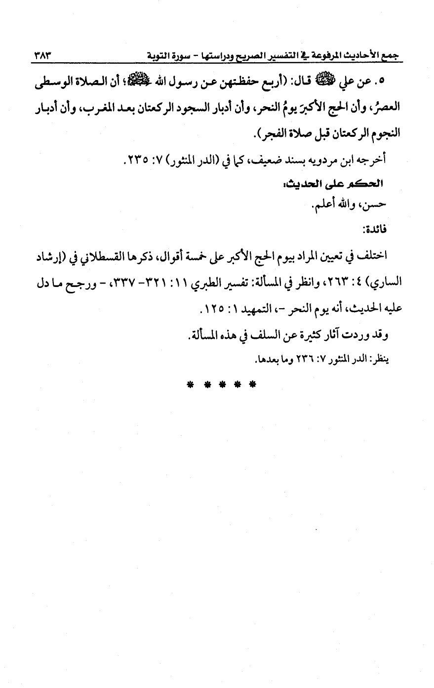 5 - عن علي -رضي الله عنه- قال: (أربع حفظتهن عن رسول الله -صلى الله عليه وسلم-؛ أن الصلاة الوسطى العصرُ، وأن الحج الأكبرَ يومُ النحر، وأن أدبار السجود الركعتان بعد المغرب، وأن أدبار النجوم الركعتان قبل صلاة الفجر).