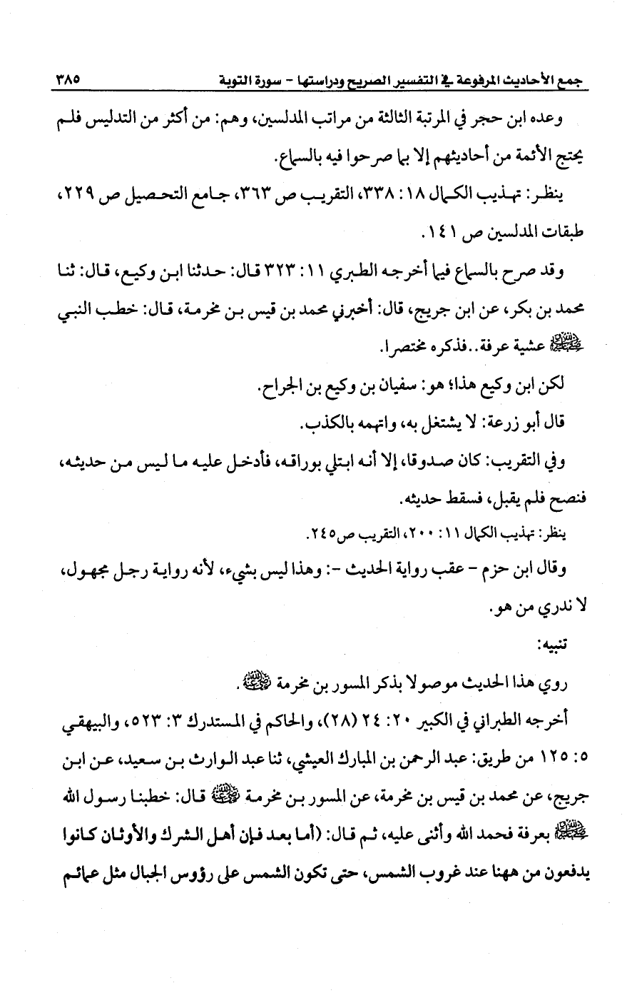وقد صرح بالسماع فيما أخرجه الطبري 11: 323 قال: حدثنا ابن وكيع، قال: ثنا محمد بن بكر، عن ابن جريج، قال: أخبرني محمد بن قيس بن مخرمة، قال: خطب النبي -صلى الله عليه وسلم- عشية عرفة .. فذكره مختصرا.