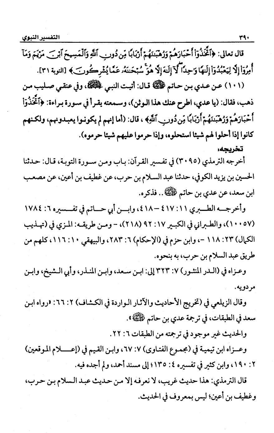 أخرجه الترمذي (3095) في تفسير القرآن: باب ومن سورة التوبة، قال: حدثنا الحسين بن يزيد الكوفي، حدثنا عبد السلام بن حرب، عن غطيف بن أعين، عن مصعب ابن سعد، عن عدي بن حاتم -رضي الله عنه- .. فذكره.