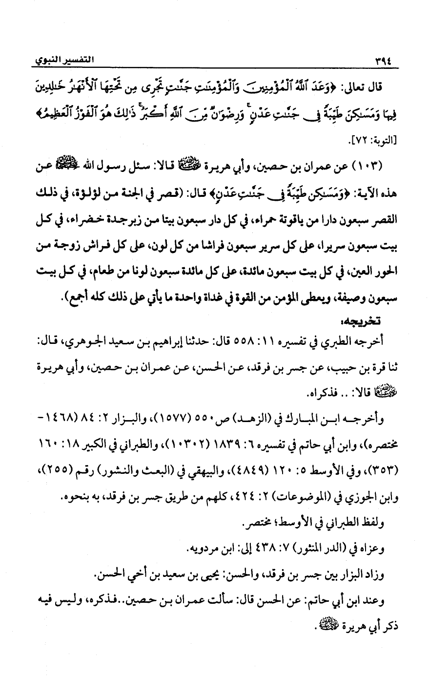 (103) عن عمران بن حصين، وأبي هريرة -رضي الله عنه- قالا: سئل رسول الله -صلى الله عليه وسلم- عن هذه الآية: {وَمَسَاكِنَ طَيِّبَةً فِي جَنَّاتِ عَدْنٍ} قال: (قصر في الجنة من لؤلؤة، في ذلك القصر سبعون دارا من ياقوتة حمراء، في كل دار سبعون بيتا من زبرجدة خضراء، في كل ببت سبعون سريرا، على كل سرير سبعون فراشا من كل لون، على كل فراش زوجة من الحور العين، في كل ببت سبعون مائدة، على كل مائدة سبعون لونا من طعام، في كل بيت سبعون وصيفة، ويعطى المؤمن من القوة في غداة واحدة ما يأتي على ذلك كله أجمع).