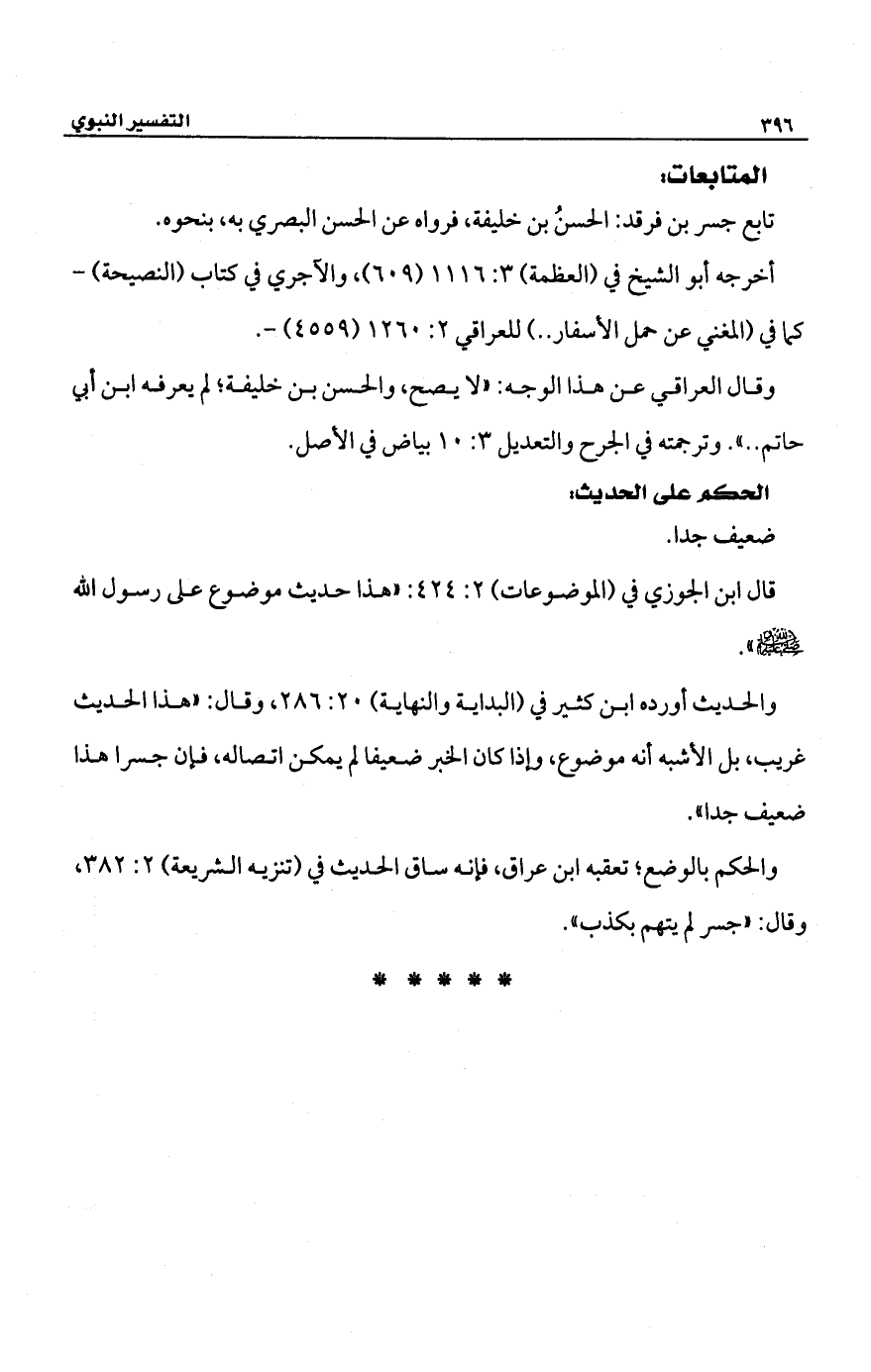 والحديث أورده ابن كثير في (البداية والنهاية) 20: 286، وقال: "هذا الحديث غريب، بل الأشبه أنه موضوع، وإذا كان الخبر ضعيفا لم يمكن اتصاله، فإن جسرا هذا ضعيف جدا".