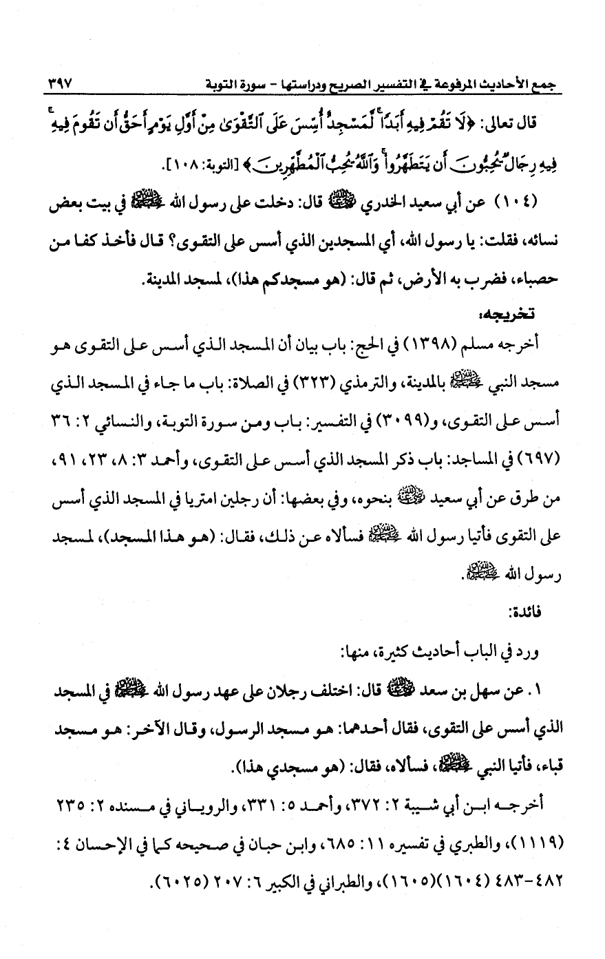 (104) عن أبي سعيد الخدري -رضي الله عنه- قال: دخلت على رسول الله -صلى الله عليه وسلم- في بيت بعض نسائه، فقلت: يا رسول الله، أي المسجدين الذي أسس على التقوى؟ قال فأخذ كفا من حصباء، فضرب به الأرض، ثم قال: (هو مسجدكم هذا)، لمسجد المدينة.