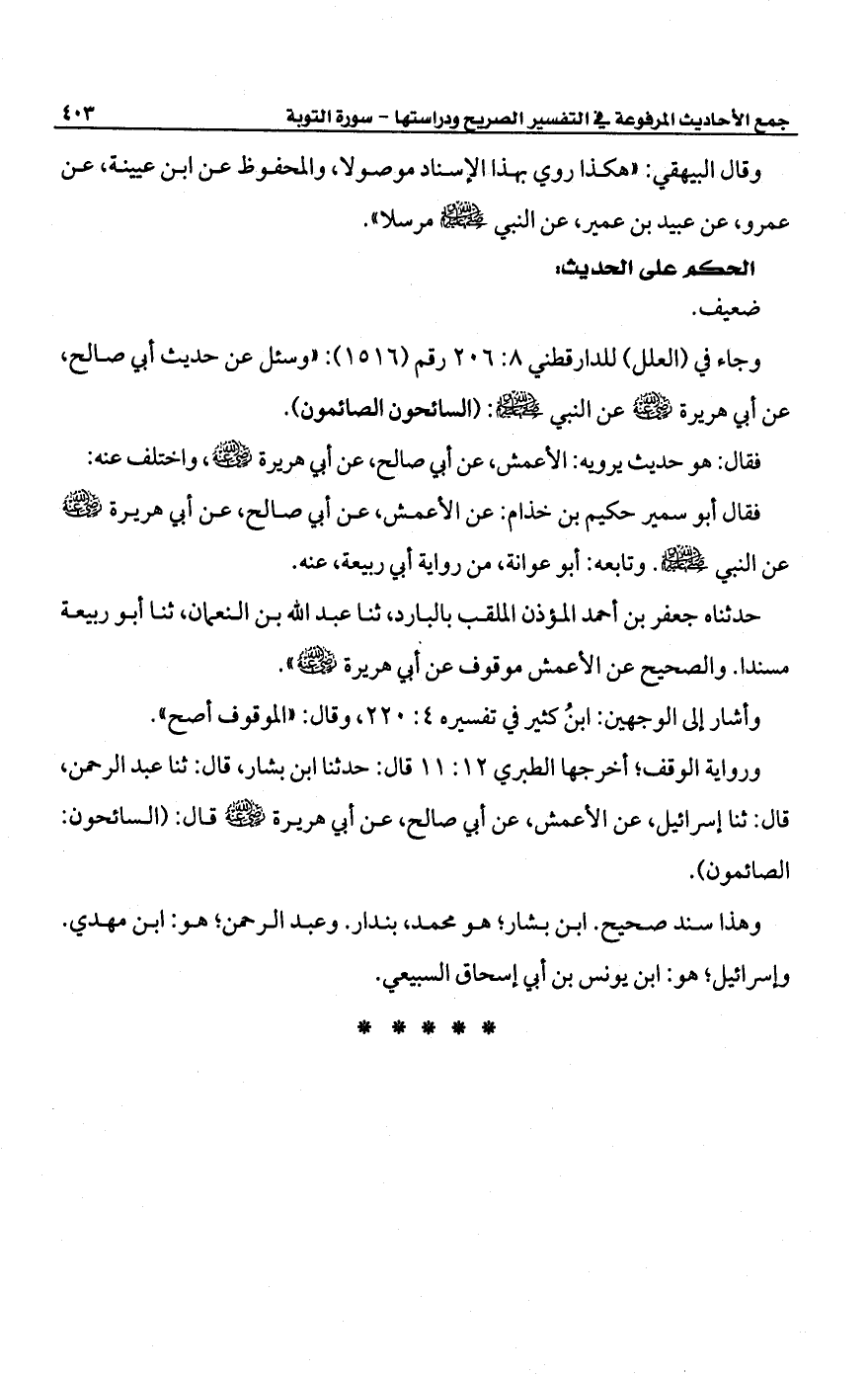 وجاء في (العلل) للدارقطني 8: 206 رقم (1516): "وسئل عن حديث أبي صالح، عن أبي هريرة -رضي الله عنه- عن النبي -صلى الله عليه وسلم-: (السائحون الصائمون).