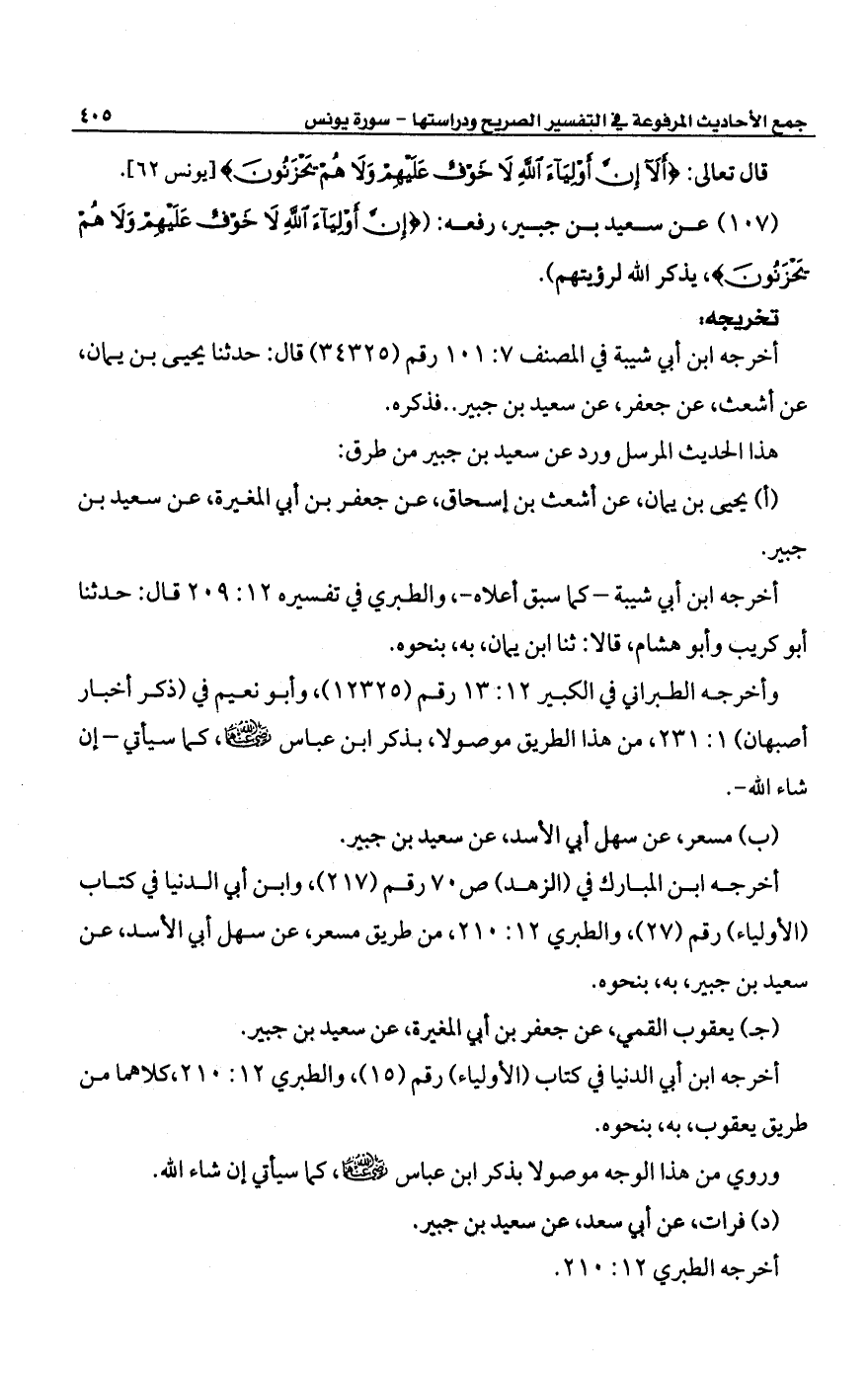 (107) عن سعيد بن جبير، رفعه: ({أَلَا إِنَّ أَوْلِيَاءَ اللَّهِ لَا خَوْفٌ عَلَيْهِمْ وَلَا هُمْ يَحْزَنُونَ} , يذكر الله لرؤيتهم).