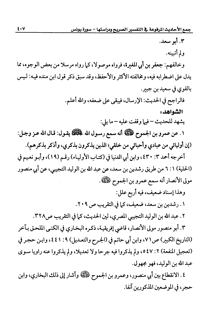 أخرجه أحمد 3: 430، وابن أبي الدنيا في (كتاب الأولياء) رقم (19)، وأبو نعيم في (الحلية) 1: 6 من طريق رشدين بن سعد، عن عبد الله بن الوليد التجيبي، عن أبي منصور مولى الأنصار أنه سمع عمرو بن الجموح -رضي الله عنه-.
