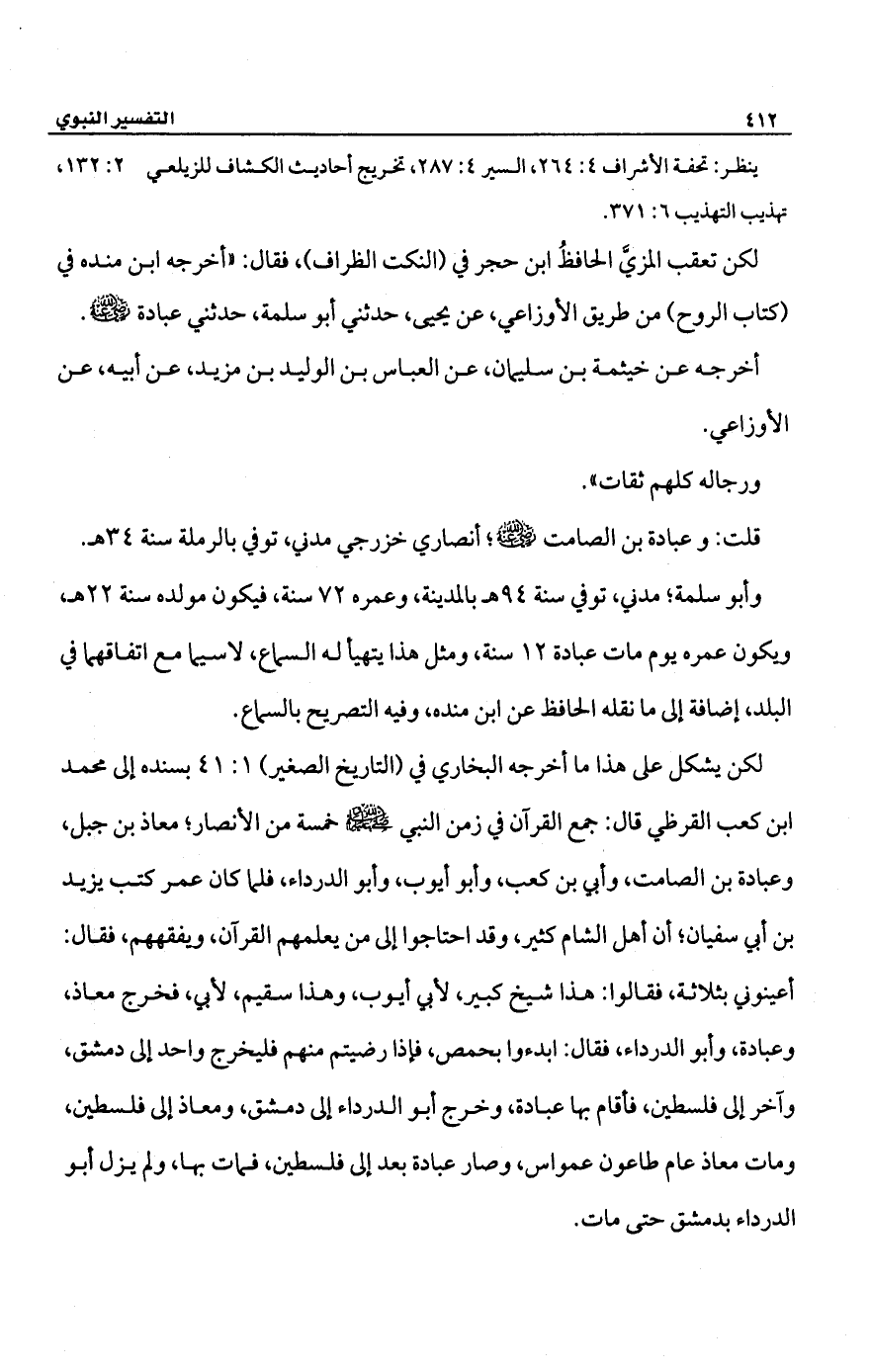 لكن يشكل على هذا ما أخرجه البخاري في (التاريخ الصغير) 1: 41 بسنده إلى محمد ابن كعب القرظي قال: جمع القرآن في زمن النبي -صلى الله عليه وسلم- خمسة من الأنصار؛ معاذ بن جبل، وعبادة بن الصامت، وأبي بن كعب، وأبو أيوب، وأبو الدرداء، فلما كان عمر كتب يزيد بن أبي سفيان؛ أن أهل الشام كثير، وقد احتاجوا إلى من يعلمهم القرآن، ويفقههم، فقال: أعينوني بثلاثة، فقالوا: هذا شيخ كبير، لأبي أيوب، وهذا سقيم، لأبي، فخرج معاذ، وعبادة، وأبو الدرداء، فقال: ابدءوا بحمص، فإذا رضيتم منهم فليخرج واحد إلى دمشق، وآخر إلى فلسطين، فأقام بها عبادة, وخرج أبو الدرداء إلى دمشق، ومعاذ إلى فلسطين، ومات معاذ عام طاعون عمواس، وصار عبادة بعد إلى فلسطين، فمات بها، ولم يزل أبو الدرداء بدمشق حتى مات.
