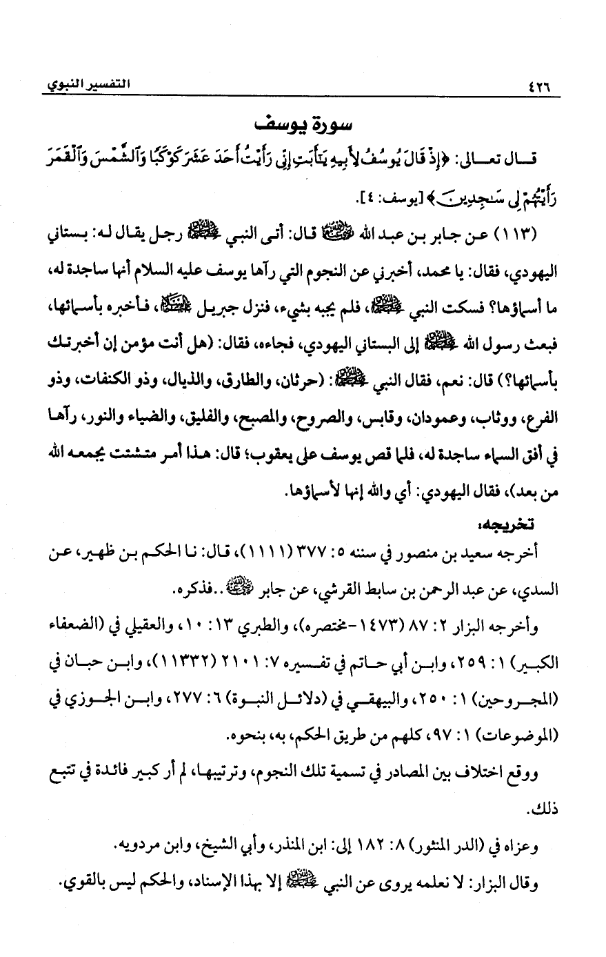 (113) عن جابر بن عبد الله -رضي الله عنهما- قال: أتى النبي -صلى الله عليه وسلم- رجل يقال له: بستاني اليهودي، فقال: يا محمد، أخبرني عن النجوم التي رآها يوسف عليه السلام أنها ساجدة له، ما أسماؤها؟ فسكت النبي -صلى الله عليه وسلم-، فلم يجبه بشيء، فنزل جبريل -عليه السلام-، فأخبره بأسمائها، فبعث رسول الله -صلى الله عليه وسلم- إلى البستاني اليهودي، فجاءه، فقال: (هل أنت مؤمن إن أخبرتك بأسمائها؟) قال: نعم، فقال النبي -صلى الله عليه وسلم-: (حرثان، والطارق، والذيال، وذو الكنفات، وذو الفرع، ووثاب، وعمودان، وقابس، والصروح، والمصبح، والفليق، والضياء والنور، رآها في أفق السماء ساجدة له، فلما قص يوسف على يعقوب؛ قال: هذا أمر متشتت يجمعه الله من بعد)، فقال اليهودي: أي والله إنها لأسماؤها.
