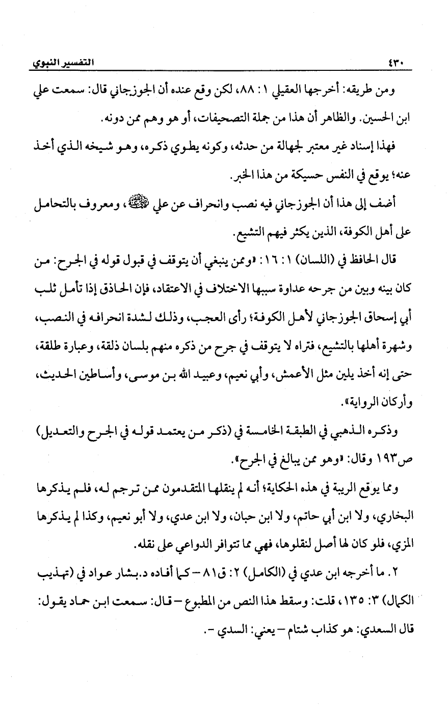 قال الحافظ في (اللسان) 1: 16: "وممن ينبغي أن يتوقف في قبول قوله في الجرح: من كان بينه وبن من جرحه عداوة سببها الاختلاف في الاعتقاد، فإن الحاذق إذا تأمل ثلب أبي إسحاق الجوزجاني لأهل الكوفة؛ رأى العجب، وذلك لشدة انحرافه في النصب، وشهرة أهلها بالتشيع، فتراه لا يتوقف في جرح من ذكره منهم بلسان ذلقة، وعبارة طلقة، حتى إنه أخذ يلين مثل الأعمش، وأبي نعيم، وعبيد الله بن موسى، وأساطين الحديث، وأركان الرواية".