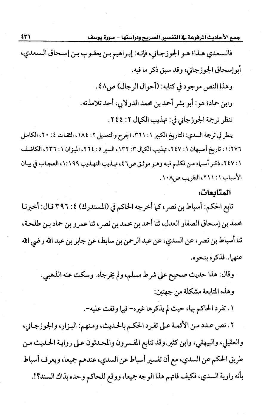ينظر في ترجمة السدي: التاريخ الكبير 1: 361، الجرح والتعديل 2: 184، الثقات 4: 20، الكامل 276: 1، تاريخ أصبهان 1: 247، تهذيب الكمال 3: 132، السير 5: 264، الميزان 1: 236، الكاشف 1: 247، ذكر أسماء من تكلم فيه وهو موثق ص 46، تهذيب التهذيب 199: 1، العجاب في بيان الأسباب 1: 211، التقريب ص 108.