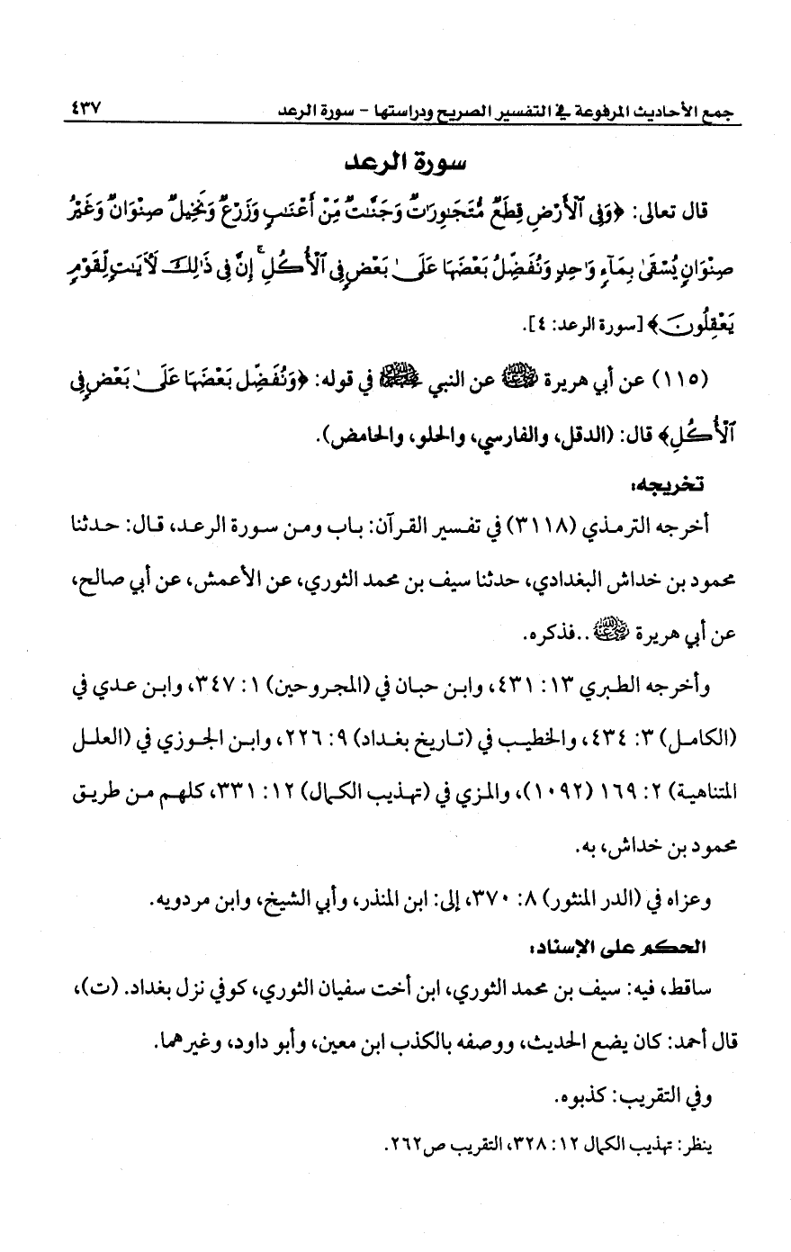 أخرجه الترمذي (3118) في تفسير القرآن: باب ومن سورة الرعد، قال: حدثنا محمود بن خداش البغدادي، حدثنا سيف بن محمد الثوري، عن الأعمش، عن أبي صالح، عن أبي هريرة -رضي الله عنه- .. فذكره.