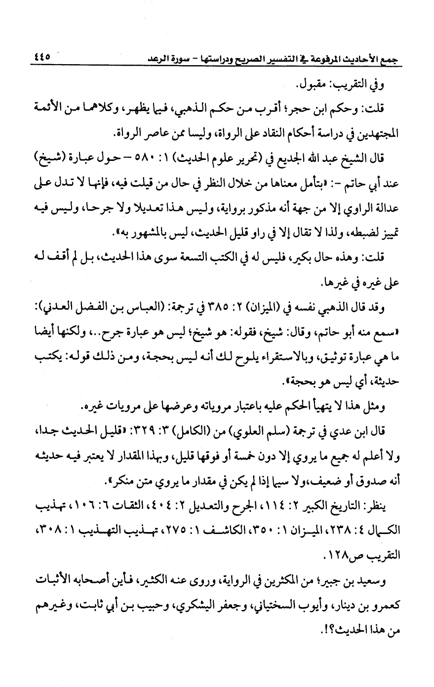 قال ابن عدي في ترجمة (سلم العلوي) من (الكامل) 3: 329: "قليل الحديث جدا، ولا أعلم له جميع ما يروي إلا دون خمسة أو فوقها قليل، وبهذا المقدار لا يعتبر فيه حديثه أنه صدوق أو ضعيف، ولاسيما إذا لم يكن في مقدار ما يروي متن منكر".