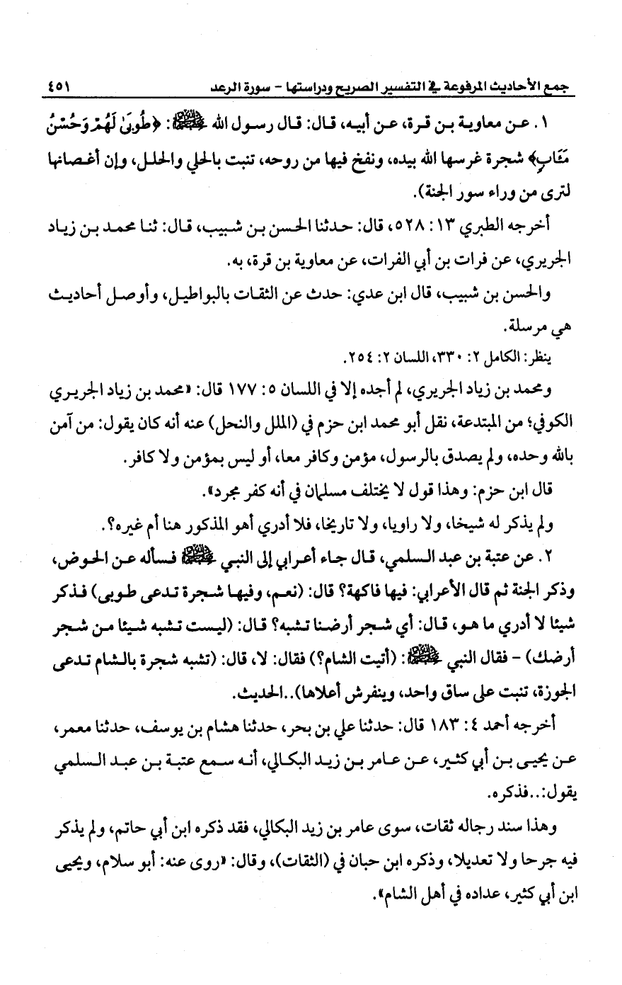 1 - عن معاوية بن قرة، عن أبيه قال: قال رسول الله -صلى الله عليه وسلم-: {طُوبَى لَهُمْ وَحُسْنُ مَآبٍ} شجرة غرسها الله بيده، ونفخ فيها من روحه، تنبت بالحلي والحلل، وإن أغصانها لترى من وراء سور الجنة).
