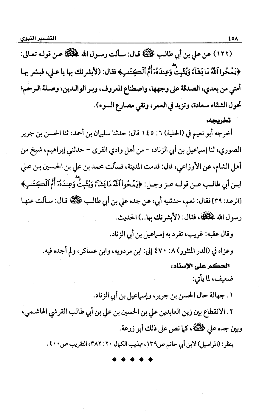 (122) عن علي بن أبي طالب -رضي الله عنه- قال: سألت رسول الله -صلى الله عليه وسلم- عن قوله تعالى: {يَمْحُو اللَّهُ مَا يَشَاءُ وَيُثْبِتُ وَعِنْدَهُ أُمُّ الْكِتَابِ} فقال: (لأبشرنك بها يا علي، فبشر بها أمتي من بعدي، الصدقة على وجهها، واصطناع المعروف، وبر الوالدين، وصلة الرحم؛ تحول الشقاء سعادة، وتزيد في العمر، وتقي مصارع السوء).