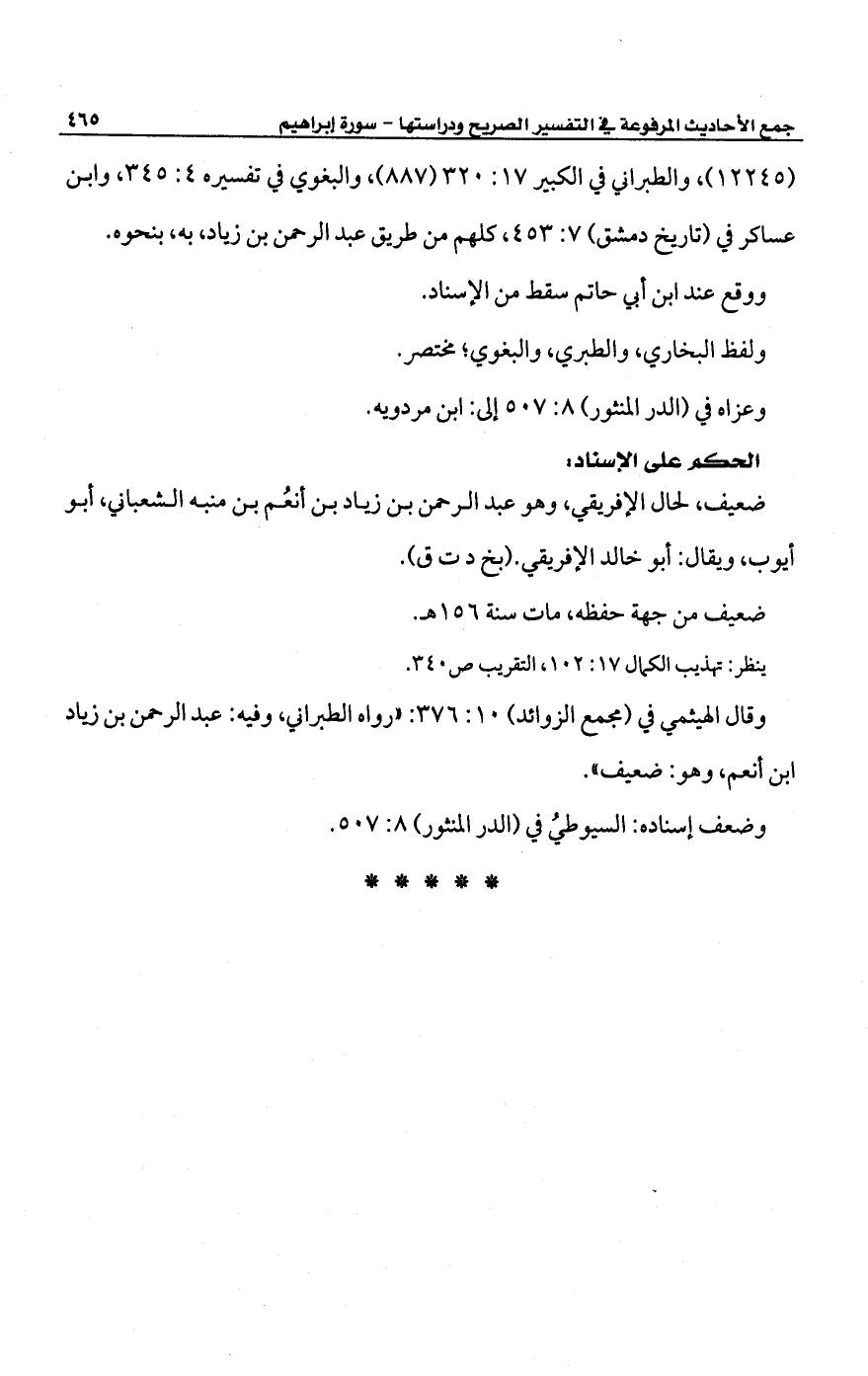 وقال الهيثمي في (مجمع الزوائد) 10: 376: "رواه الطبراني، وفيه: عبد الرحمن بن زياد ابن أنعم، وهو: ضعيف".