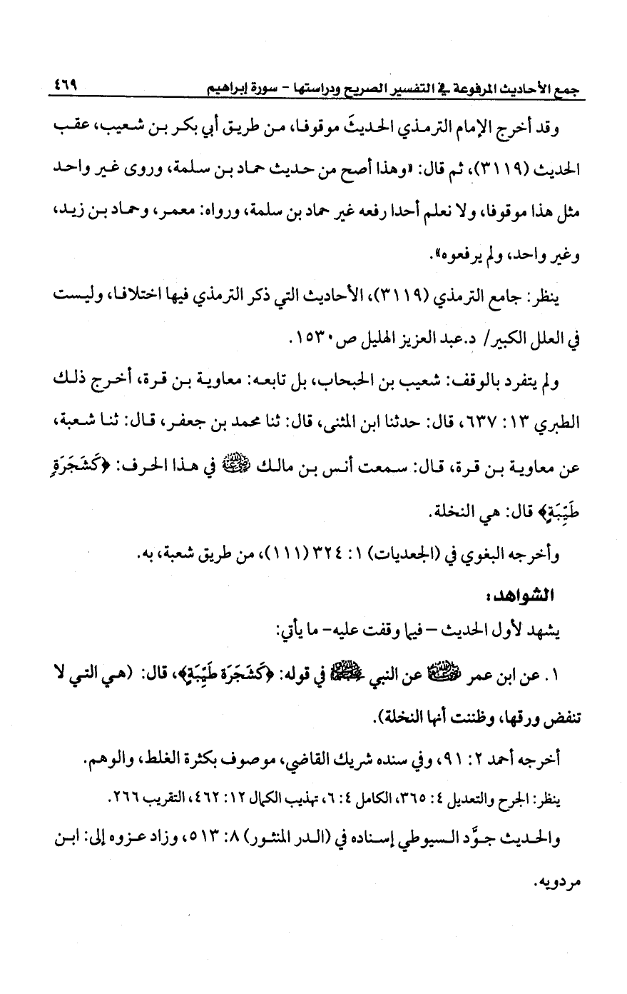 ولم يتفرد بالوقف: شعيب بن الحبحاب، بل تابعه: معاوية بن قرة، أخرج ذلك الطبري 13: 637، قال: حدثنا ابن المثنى، قال: ثنا محمد بن جعفر، قال: ثنا شعبة، عن معاوية بن قرة، قال: سمعت أنس بن مالك -رضي الله عنه- في هذا الحرف: {كَشَجَرَةٍ طَيِّبَةٍ} قال: هي النخلة.