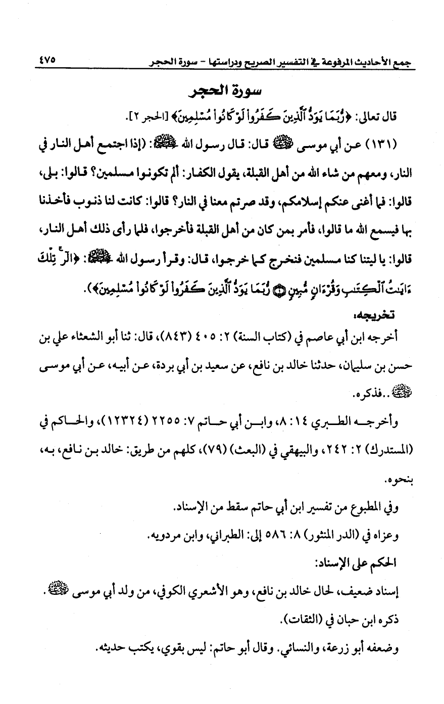 (131) عن أبي موسى -رضي الله عنه- قال: قال رسول الله -صلى الله عليه وسلم-: (إذا اجتمع أهل النار في النار، ومعهم من شاء الله من أهل القبلة، يقول الكفار: ألم تكونوا مسلمين؟ قالوا: بلى، قالوا: فما أغنى عنكم إسلامكم، وقد صرتم معنا في النار؟ قالوا: كانت لنا ذنوب فأخذنا بها فيسمع الله ما قالوا، فأمر بمن كان من أهل القبلة فأخرجوا، فلما رأى ذلك أهل النار، قالوا: يا ليتنا كنا مسلمين فنخرج كما خرجوا، قال: وقرأ رسول الله -صلى الله عليه وسلم-: {الر تِلْكَ آيَاتُ الْكِتَابِ وَقُرْآنٍ مُبِينٍ (1) رُبَمَا يَوَدُّ الَّذِينَ كَفَرُوا لَوْ كَانُوا مُسْلِمِينَ}).