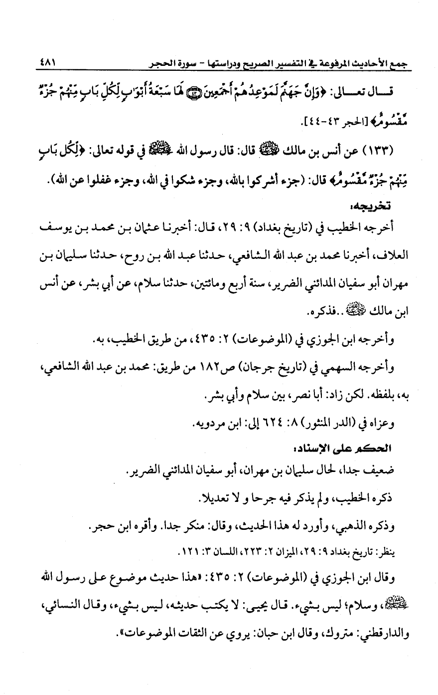 (133) عن أنس بن مالك -رضي الله عنه- قال: قال رسول الله -صلى الله عليه وسلم- في قوله تعالى: {لِكُلِّ بَابٍ مِنْهُمْ جُزْءٌ مَقْسُومٌ} قال: (جزء أشركوا بالله، وجزء شكوا في الله، وجزء غفلوا عن الله).