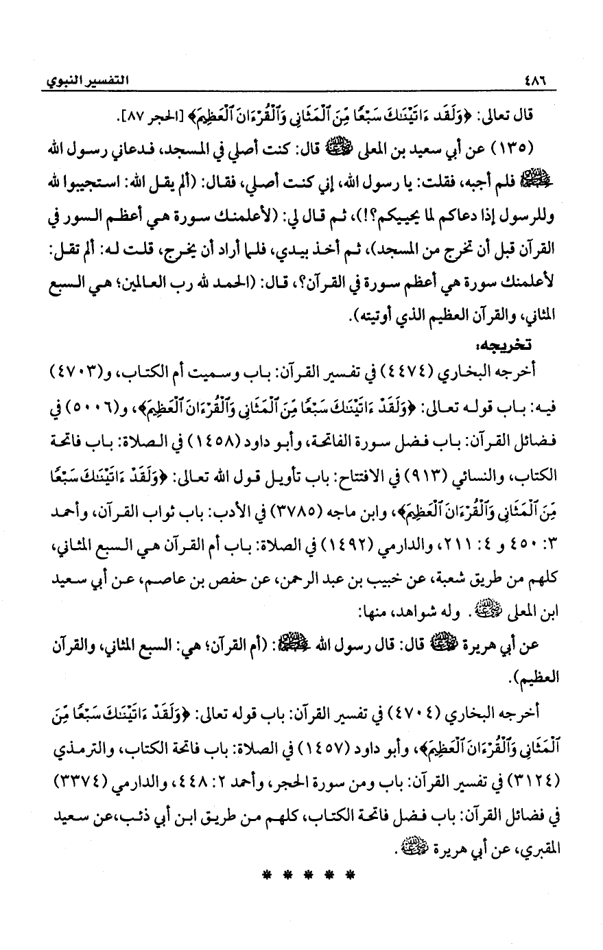 (135) عن أبي سعيد بن المعلى -رضي الله عنه- قال: كنت أصلي في المسجد، فدعاني رسول الله -صلى الله عليه وسلم- فلم أجبه، فقلت: يا رسول الله، إني كنت أصلي، فقال: (ألم يقل الله: استجيبوا لله وللرسول إذا دعاكم لما يحييكم؟!)، ثم قال لي: (لأعلمنك سورة هي أعظم السور في القرآن قبل أن تخرج من المسجد)، ثم أخذ بيدي، فلما أراد أن يخرج، قلت له: ألم تقل: لأعلمنك سورة هي أعظم سورة في القرآن؟، قال: (الحمد لله رب العالمين؛ هي السبع المثاني، والقرآن العظيم الذي أوتيته).