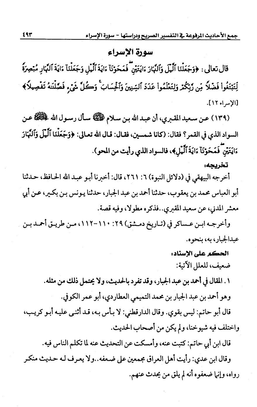 (139) عن سعيد المقبري، أن عبد الله بن سلام -رضي الله عنه- سأل رسول الله -صلى الله عليه وسلم- عن السواد الذي في القمر؟ فقال: (كانا شمسين، فقال: قال الله تعالى: {وَجَعَلْنَا اللَّيْلَ وَالنَّهَارَ آيَتَيْنِ فَمَحَوْنَا آيَةَ اللَّيْلِ}، فالسواد الذي رأيت من المحو).