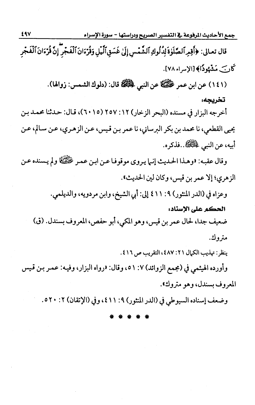 وقال عقبه: "وهذا الحديث إنما يروى موقوفا عن ابن عمر -رضي الله عنهما- ولم يسنده عن الزهري؛ إلا عمر بن قيس، وكان لين الحديث".