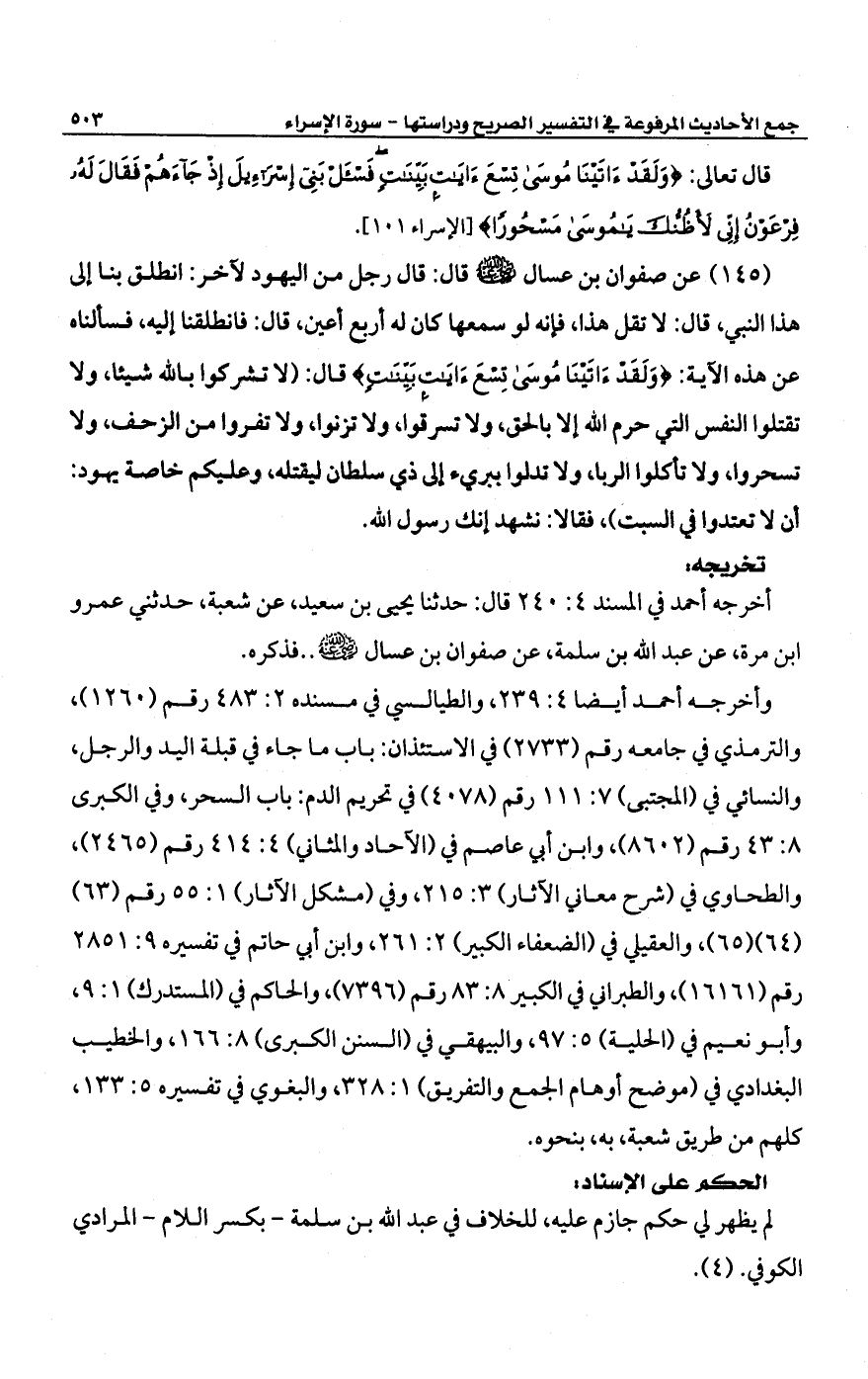 (145) عن صفوان بن عسال -رضي الله عنه- قال: قال رجل من اليهود لآخر: انطلق بنا إلى هذا النبي، قال: لا تقل هذا، فإنه لو سمعها كان له أربع أعين، قال: فانطلقنا إليه، فسألناه عن هذه الآية: {وَلَقَدْ آتَيْنَا مُوسَى تِسْعَ آيَاتٍ بَيِّنَاتٍ} قال: (لا تشركوا بالله شيئًا، ولا تقتلوا النفس التي حرم الله إلا بالحق، ولا تسرقوا، ولا تزنوا، ولا تفروا من الزحف، ولا تسحروا، ولا تأكلوا الربا، ولا تدلوا ببريء إلى ذي سلطان ليقتله، وعليكم خاصة يهود: أن لا تعتدوا في السبت)، فقالا: نشهد إنك رسول الله.