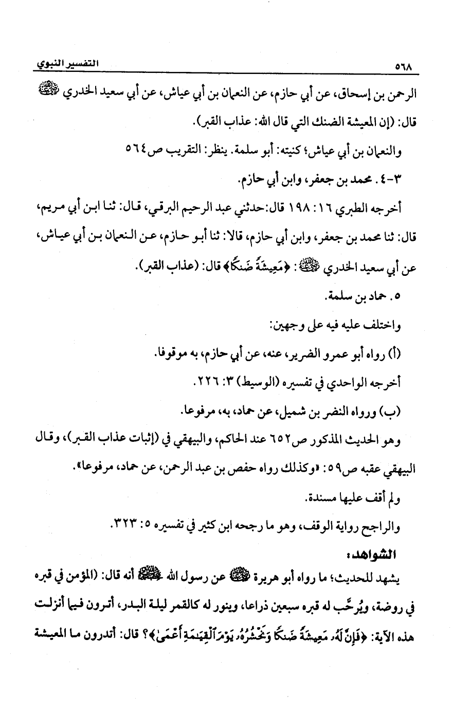 الرحمن بن إسحاق، عن أبي حازم، عن النعمان بن أبي عياش، عن أبي سعيد الخدري -رضي الله عنه- قال: (إن المعيشة الضنك التي قال الله: عذاب القبر).