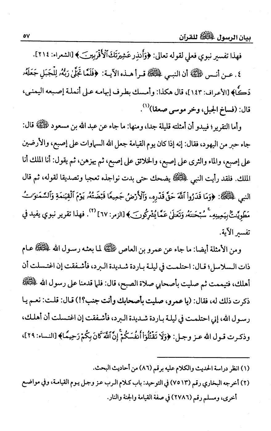 وأما التقرير؛ فيبدو أن أمثلته قليلة جدا، ومنها: ما جاء عن عبد الله بن مسعود -رضي الله عنه- قال: جاء حبر من اليهود، فقال: إنه إذا كان يوم القيامة جعل الله السماوات على إصبع، والأرضين على إصبع، والماء والثرى على إصبع، والخلائق على إصبع، ثم يهزهن، ثم يقول: أنا الملك أنا الملك. فلقد رأيت النبي -صلى الله عليه وسلم- يضحك حتى بدت نواجذه تعجبا وتصديقا لقوله، ثم قال النبي -صلى الله عليه وسلم-: {وَمَا قَدَرُوا اللَّهَ حَقَّ قَدْرِهِ وَالْأَرْضُ جَمِيعًا قَبْضَتُهُ يَوْمَ الْقِيَامَةِ وَالسَّمَاوَاتُ مَطْوِيَّاتٌ بِيَمِينِهِ سُبْحَانَهُ وَتَعَالَى عَمَّا يُشْرِكُونَ} [الزمر: 67] (¬2). فهذا تقرير نبوي يفيد في تفسير الآية.