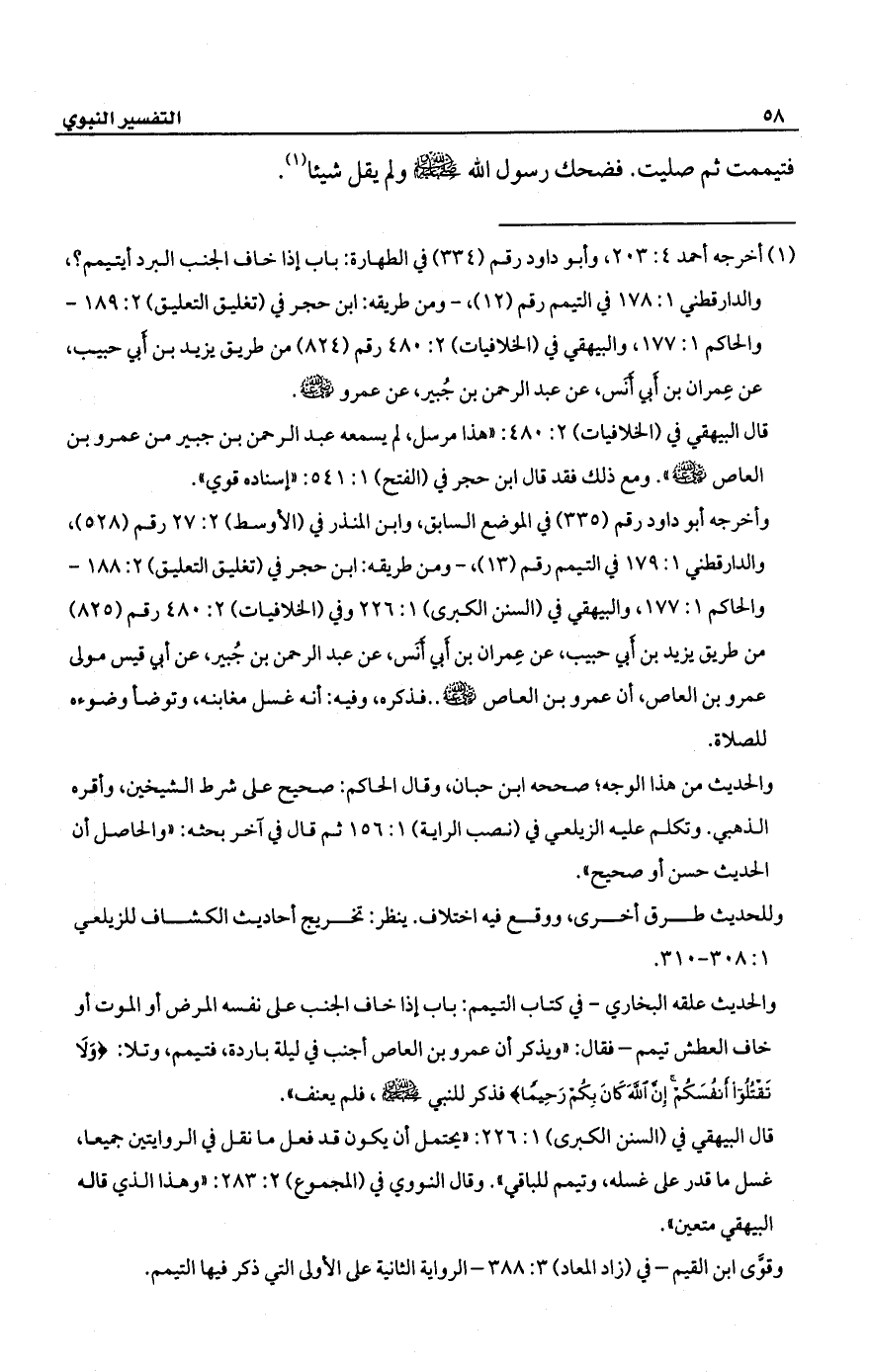 (¬1) أخرجه أحمد 4: 203، وأبو داود رقم (334) في الطهارة: باب إذا خاف الجنب البرد أيتيمم؟، والدارقطني 1: 178 في التيمم رقم (12)، -ومن طريقه: ابن حجر في (تغليق التعليق) 2: 189 - والحاكم 1: 177، والبيهقي في (الخلافيات) 2: 480 رقم (824) من طريق يزيد بن أبي حبيب، عن عِمران بن أبي أَنَس، عن عبد الرحمن بن جُبير، عن عمرو -رضي الله عنه-.
