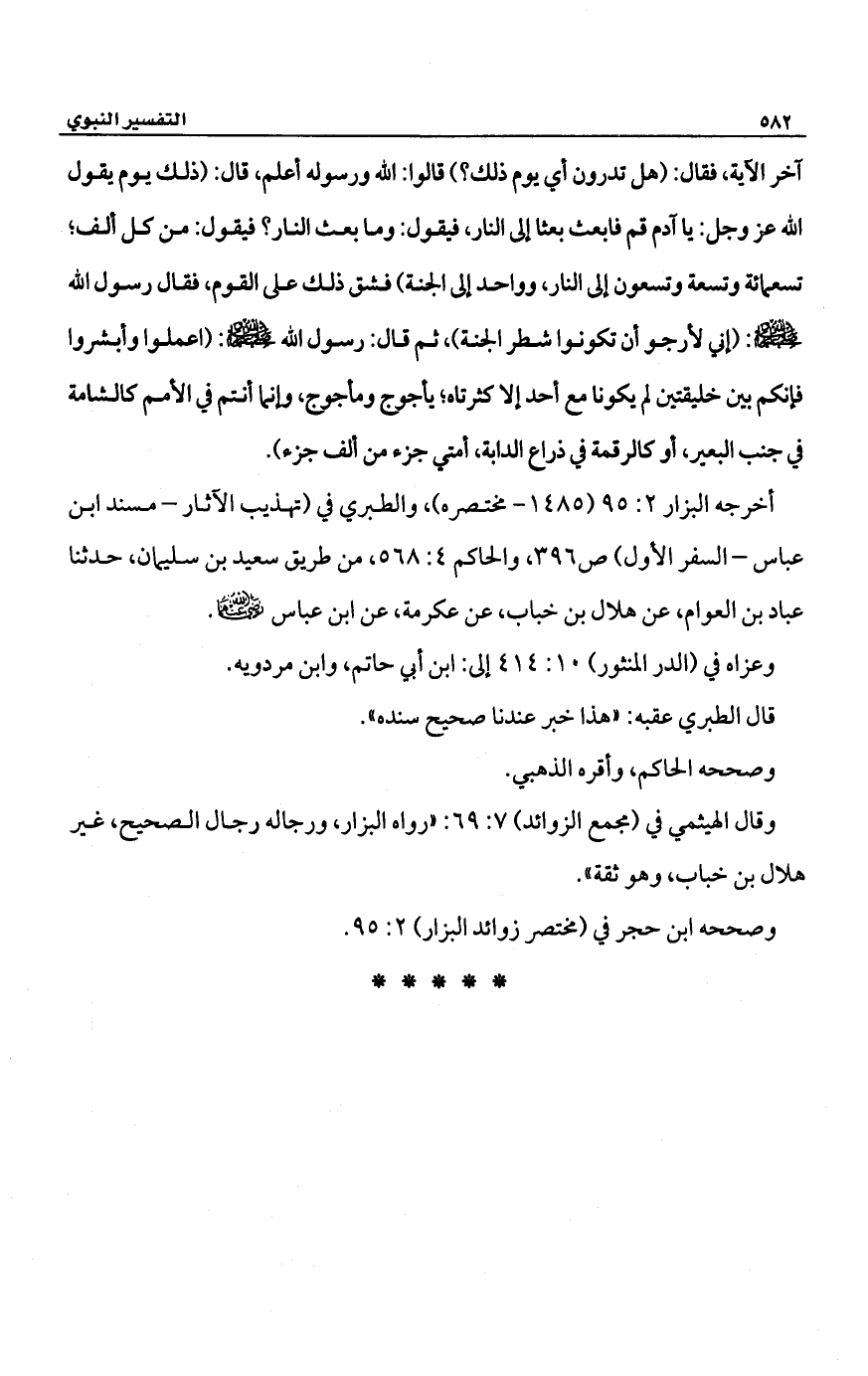 آخر الآية، فقال: (هل تدرون أي يوم ذلك؟) قالوا: الله ورسوله أعلم، قال: (ذلك يوم يقول الله عز وجل: يا آدم قم فابعث بعثًا إلى النار، فيقول: وما بعث النار؟ فيقول: من كل ألف؛ تسعمائة وتسعة وتسعون إلى النار، وواحد إلى الجنة) فشق ذلك على القوم، فقال رسول الله -صلى الله عليه وسلم-: (إني لأرجو أن تكونوا شطر الجنة)، ثم قال: رسول الله -صلى الله عليه وسلم-: (اعملوا وأبشروا فإنكم بين خليقتين لم يكونا مع أحد إلا كثرتاه؛ يأجوج ومأجوج، وإنما أنتم في الأمم كالشامة في جنب البعير، أو كالرقمة في ذراع الدابة، أمتي جزء من ألف جزء).